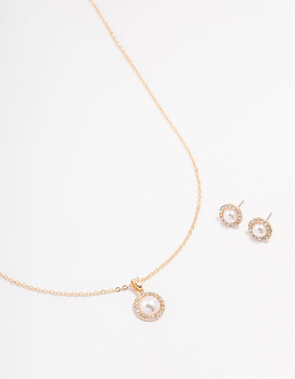 Gold Diamante & Pearl Halo Necklace & Stud Earrings Set