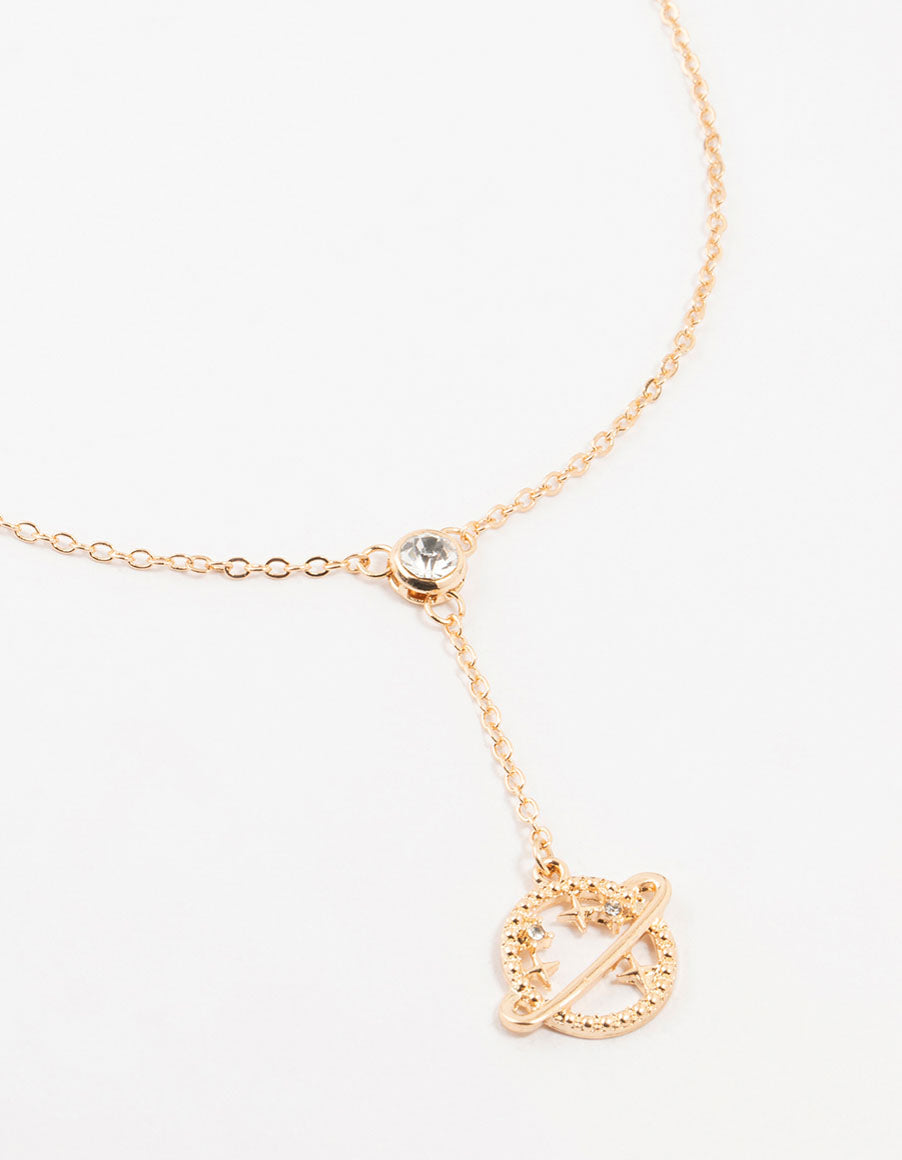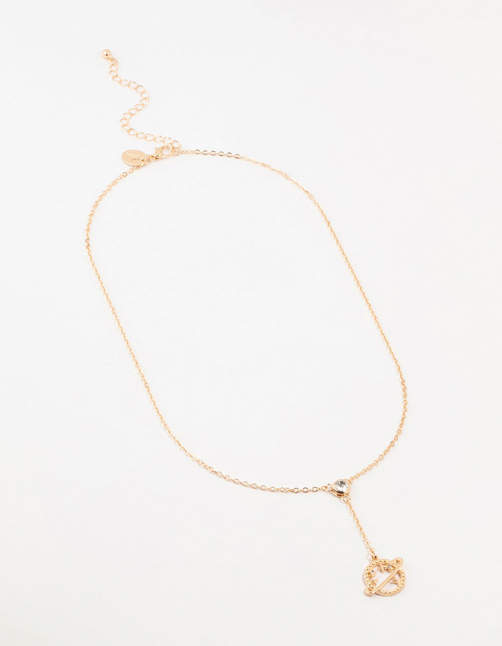 Shoot for the stars with this cosmic gold necklace. Featuring a gleaming gold base and dazzling diamante crystals in an out-of-this-world pendant, it's perfect for adding some shimmery planetary glamour to your look.