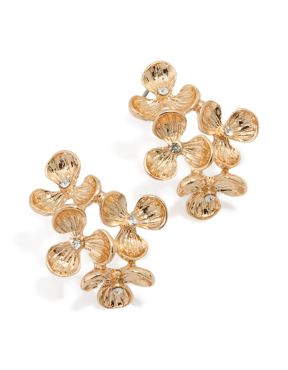 Get ready to shine with these Gold Diamante Textured Flower Stud Earrings. Featuring a delicate floral design with a textured gold-tone finish and shimmering diamantes at the centre, these stud earrings are a must-have for any jewellery collection. Ideal for evenings out or special occasions, they add a touch of glamour to everything from sleek cocktail dresses to tailored blazers. Whether you're heading to a party, a dinner date, or a formal event, these lightweight and versatile earrings are the ultimate finishing touch.