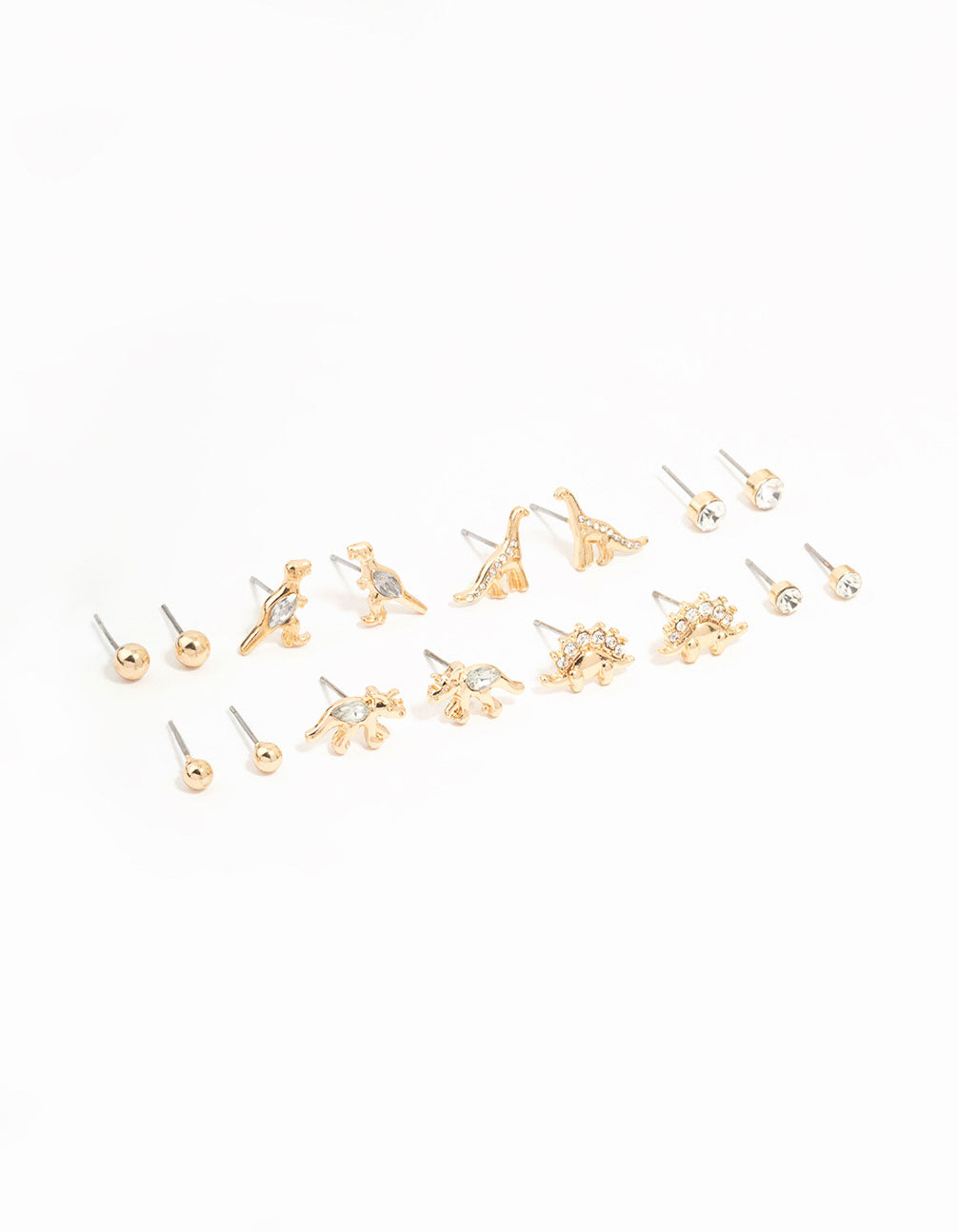 Gold Dinosaur & Diamante Stud Earrings 8-Pack