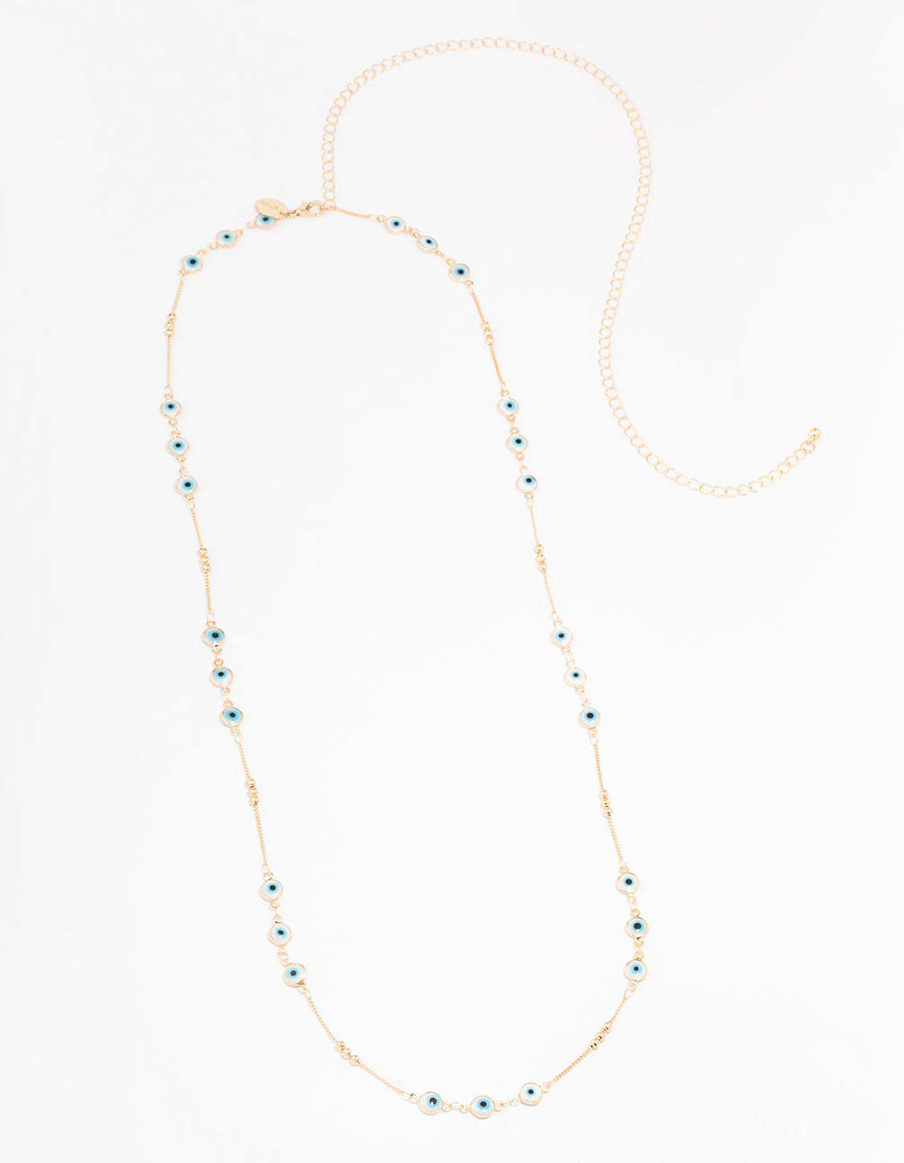 Accessorise like you're on vacation with this trendy wait chain. This unique chain features a dainty gold chain, adorned with mini evil eye charms for a decorative touch.