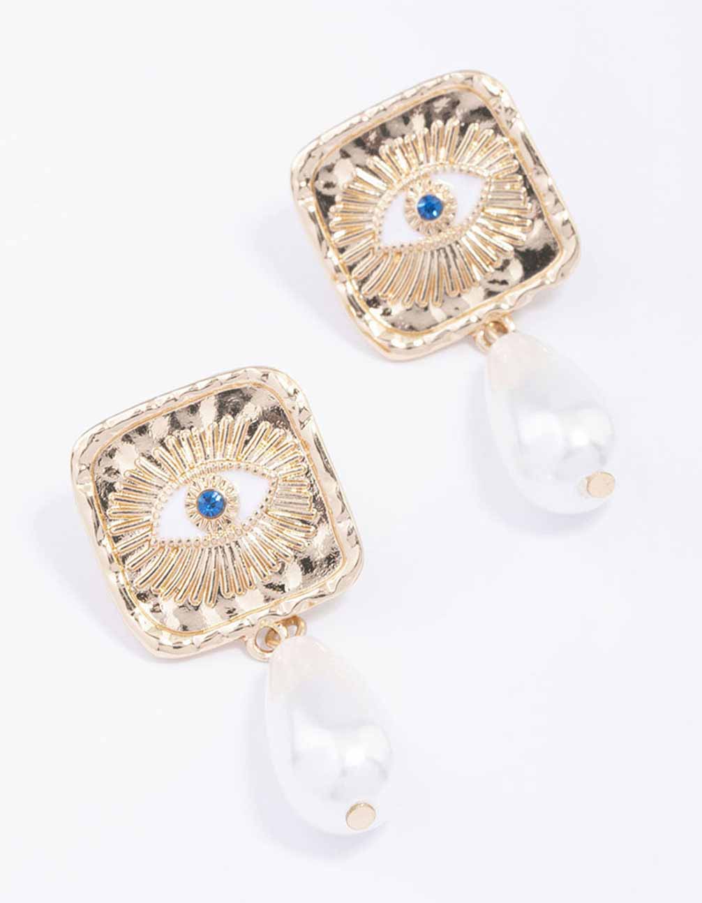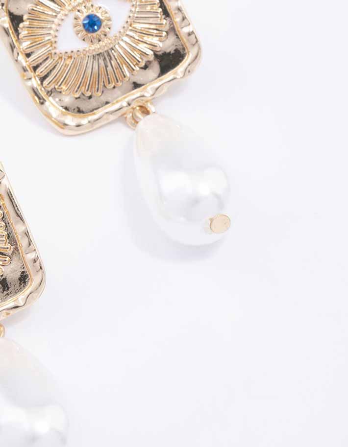 These drop earrings feature lustrous pearls and an ornate, evil eye charm as a symbol of protection and good luck.