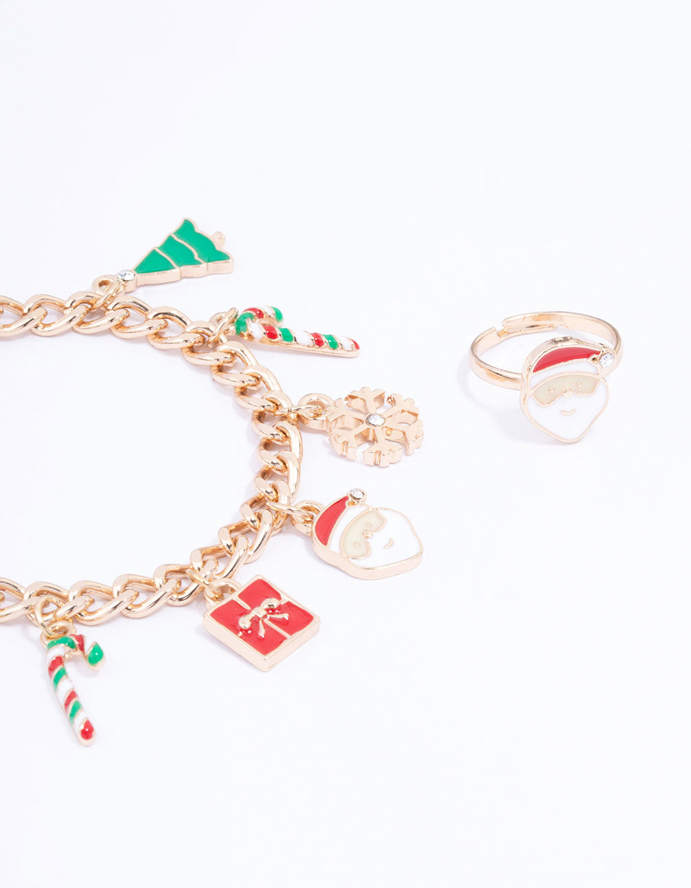 Get into the festive spirit with this Gold Festive Motif Charm Bracelet & Ring Set, a fun and stylish jewellery duo perfect for the holiday season. The gold-tone charm bracelet is adorned with playful festive designs, including sparkling diamante snowflake charms, colourful candy cane charms, cute present charms in red and green, an adorable Santa head charm, and a green Christmas tree charm. Completing the set is a matching Santa head ring, adding a cheerful touch to your look.