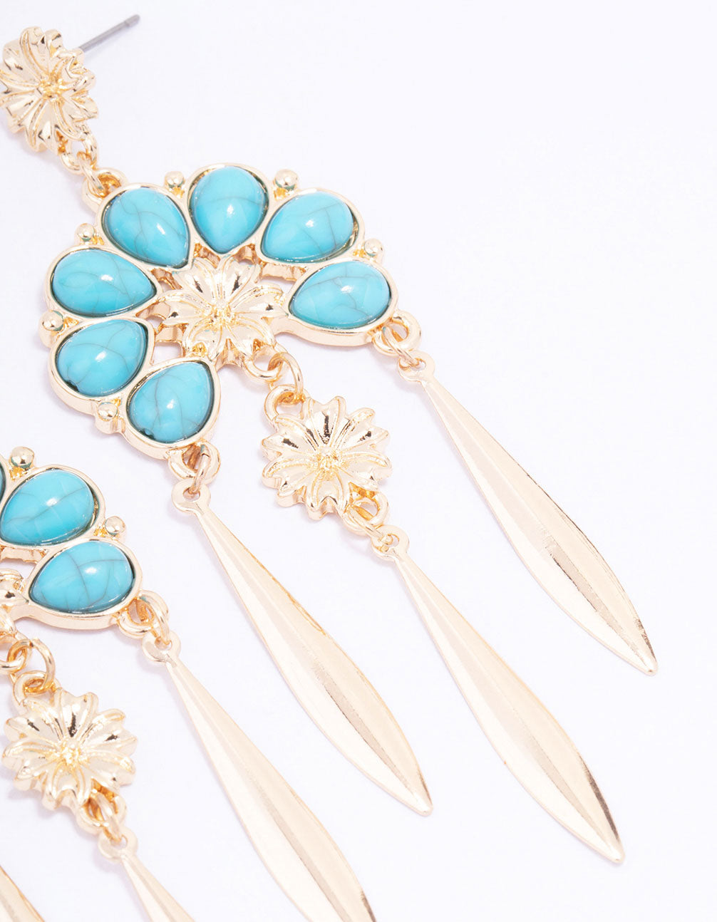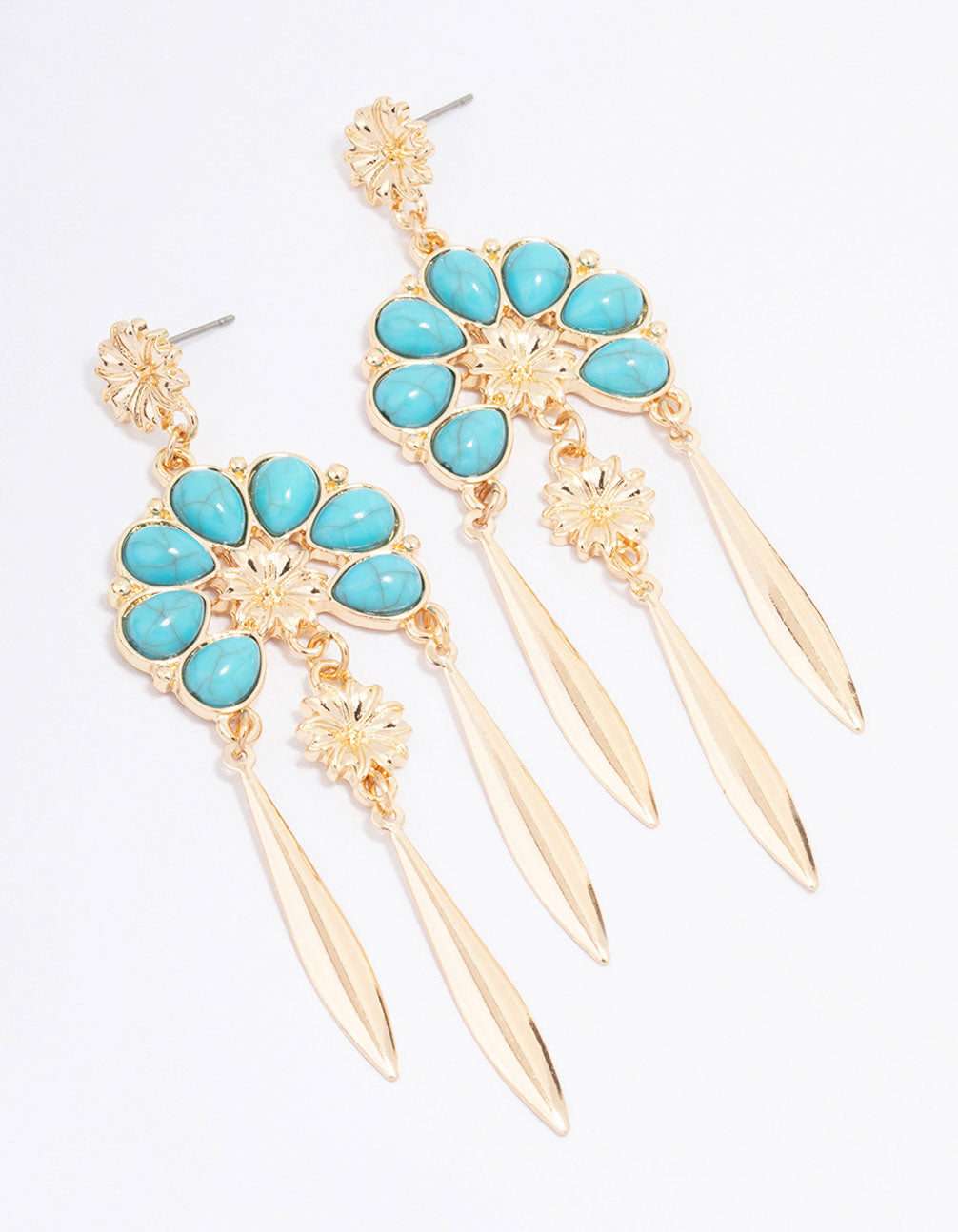 Add detail to your look with these unique drop earrings. These eye-catching statement earrings feature a gold-toned setting, adorned with turquoise stones for a boho-inspired look.