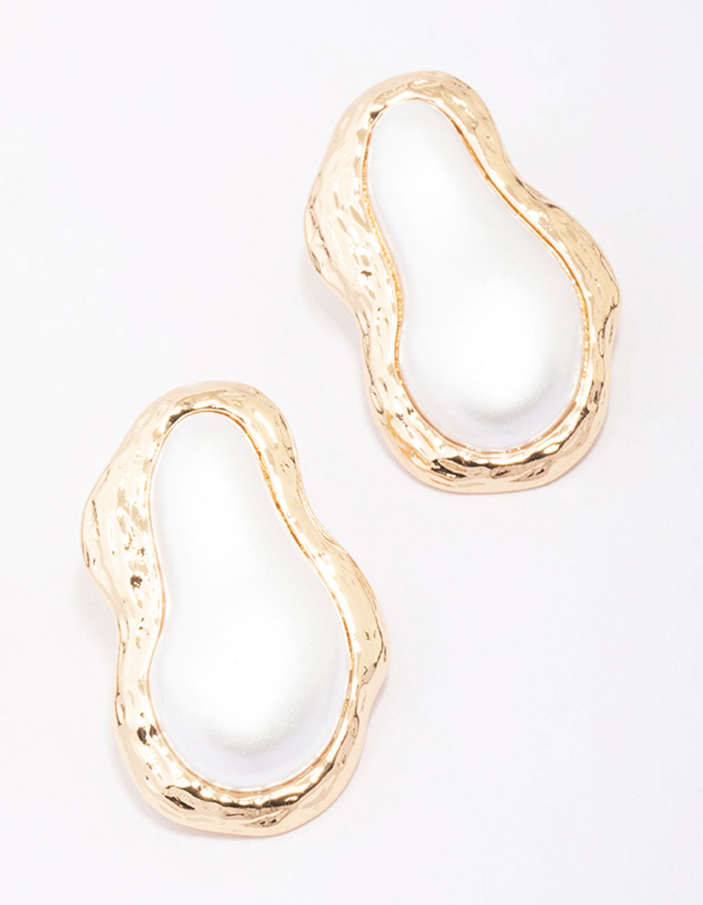 For a modern addition to your stack, style these golden statement studs. These large stud earrings feature a gold, textured outline adorned with organic-shaped pearls in the centre. Perfect for adding interest to your stack!