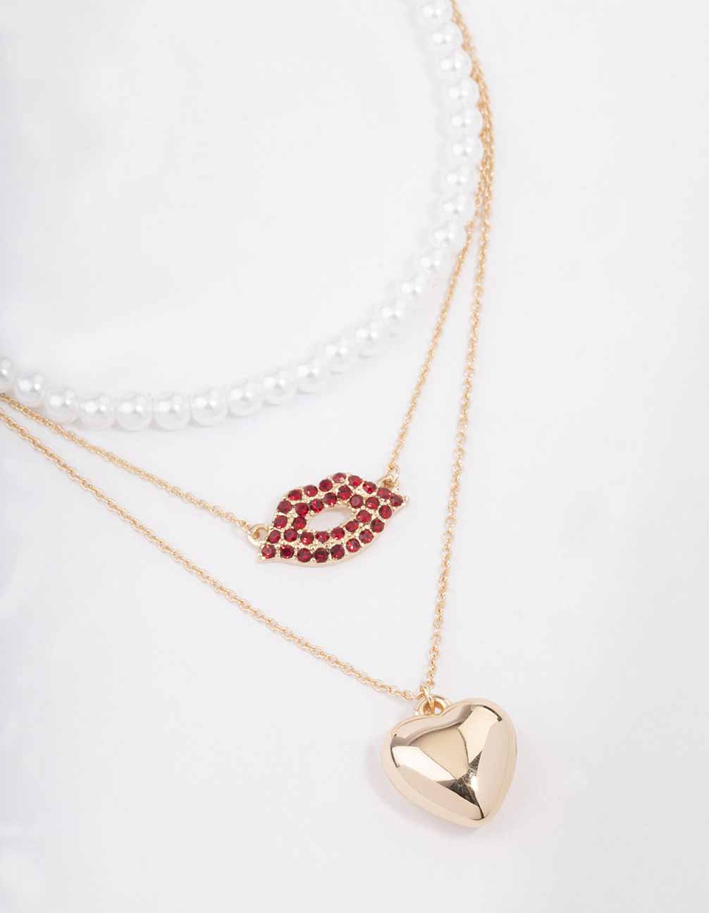 This layered necklace features a gorgeous, gold-toned setting adorned with love heart and lip charms for an on-theme finish to your look.