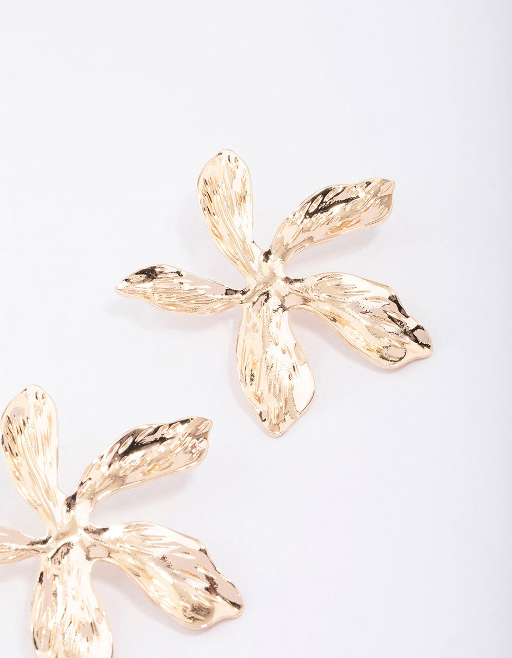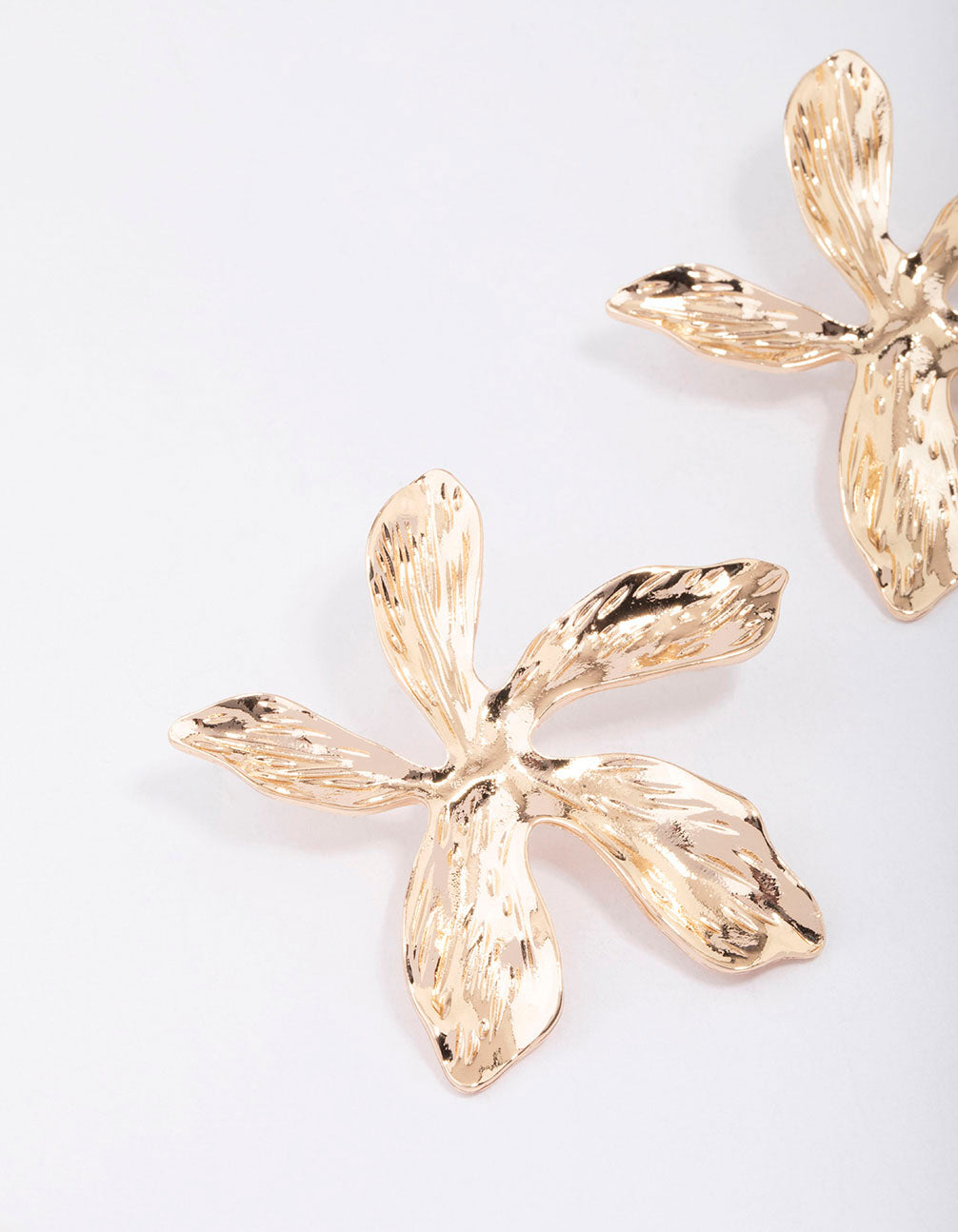 These stud earrings feature a large, golden flower design with a textured finish. Perfect for adding detail and interest to your look!