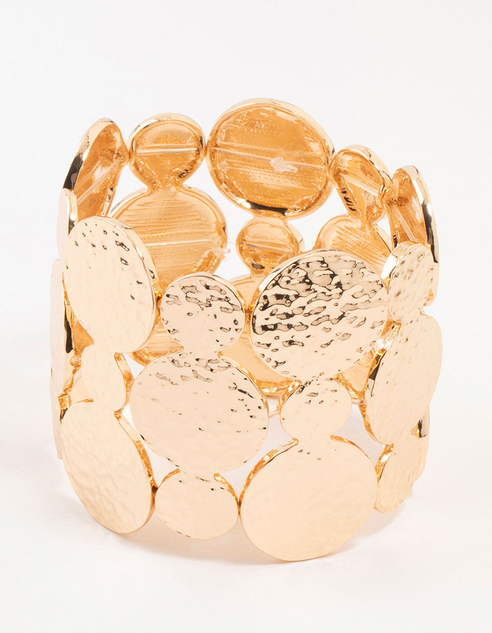 Embrace the molten trend Gold Molten Disc Stretch Bracelet. This bracelet features gleaming gold-toned layered discs and stretches to hug your wrist for a chic, effortless look. This bracelet adds a touch of enchanting flair to any outfit.