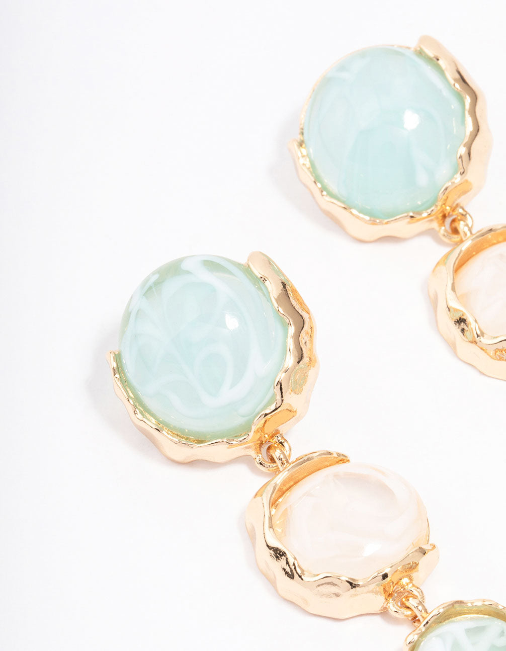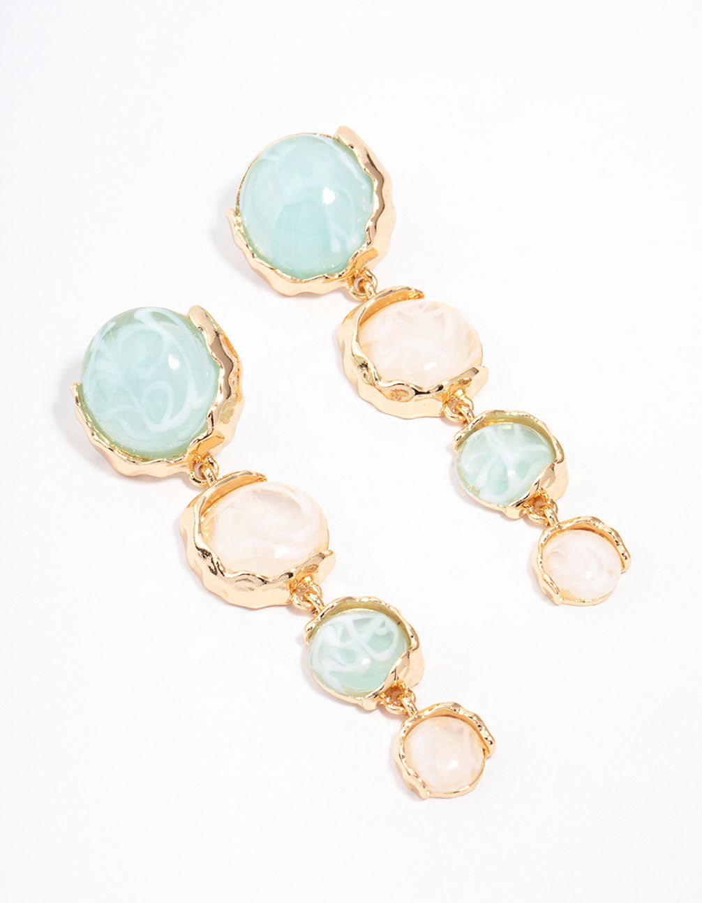 These lovely golden drop earrings feature a graduating design of stones and a molten textured setting.