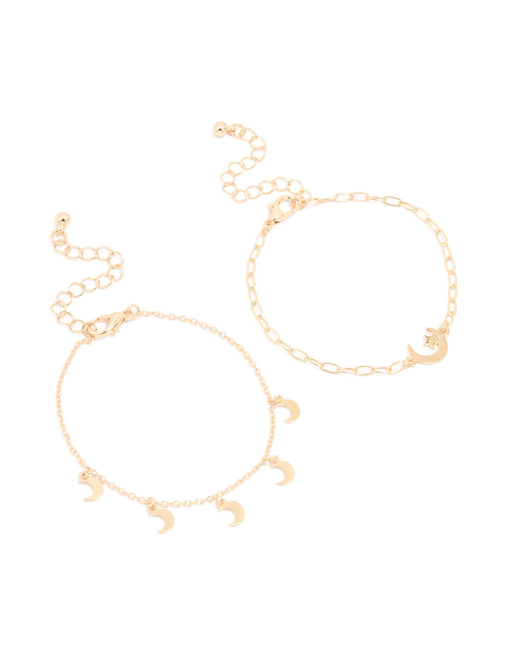 Add a touch of celestial charm to your jewellery collection with the Gold Moon Celestial Bracelets 2-Pack. This stunning set includes two delicate gold-tone bracelets, one adorned with a crescent moon design and the other featuring dainty celestial charms. Perfect for stacking or wearing solo, these bracelets are versatile enough to dress up your everyday look or add sparkle to a night out. Pair them with a flowy dress for boho vibes or layer with rings for an effortlessly chic finish. Whether you're searching for gold bracelets, celestial jewellery, or dainty accessories, this set is a must-have for your wardrobe. Ideal for gifting or treating yourself, these beauties are ready to shine wherever you go!