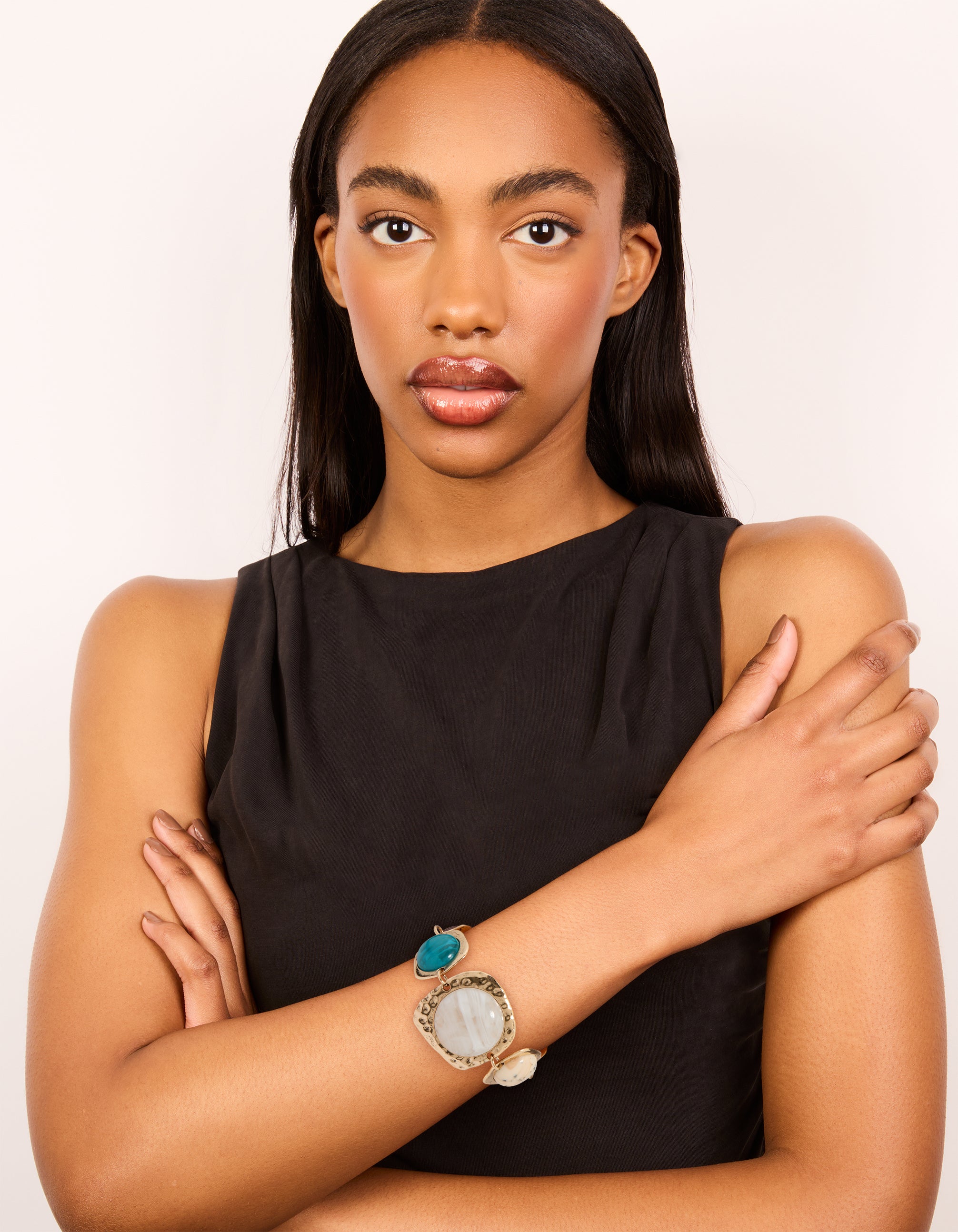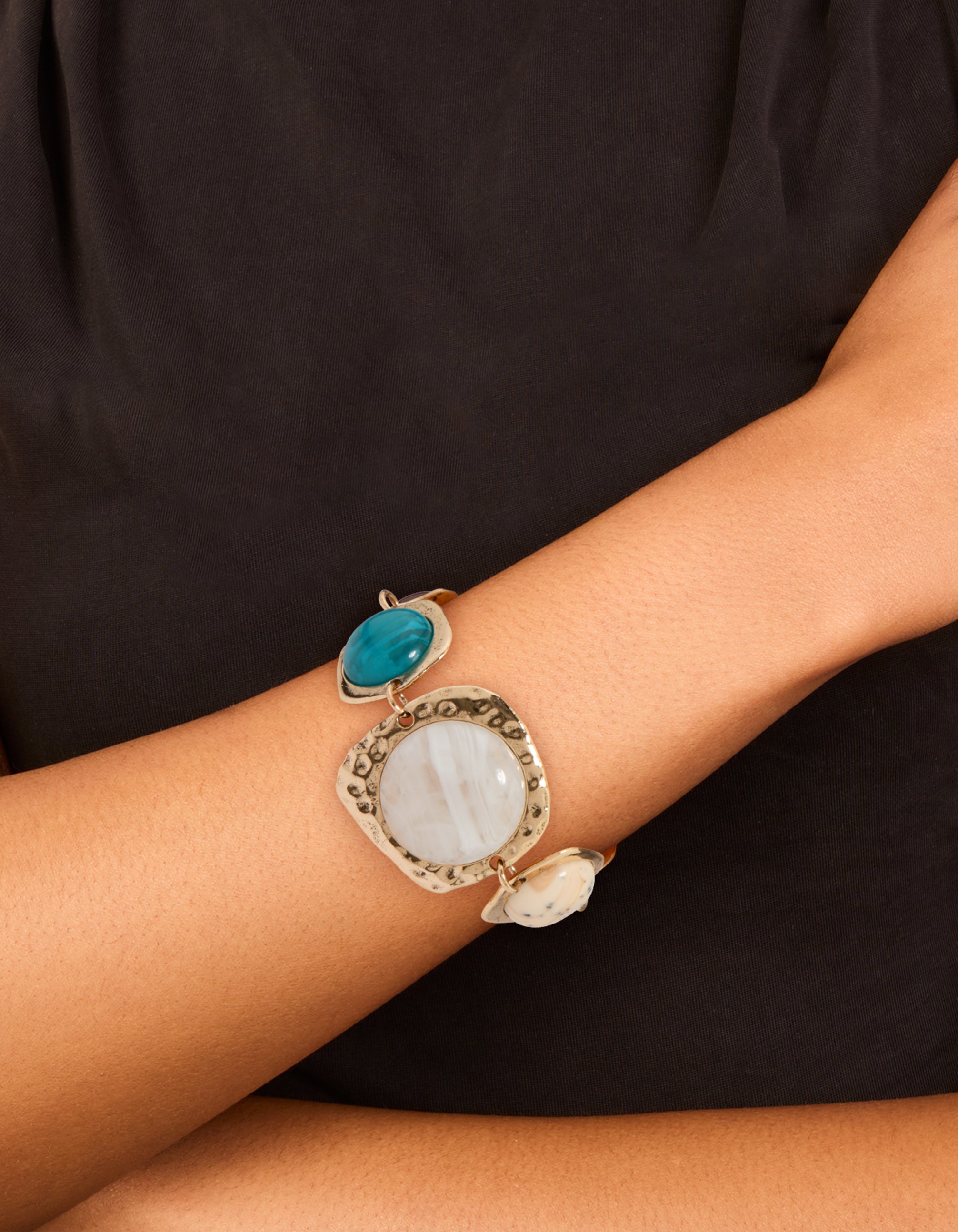Add a pop of colour and charm to your look with this Gold Multicoloured Organic Stones Bracelet! This striking bracelet blends natural-inspired beauty with a contemporary edge. Featuring white stones, a speckled design stone, a turquoise-toned stone, and a burgundy-toned stone, it's all about that vibrant, earthy vibe. Perfect for festivals, brunch dates, or simply brightening up your everyday wardrobe, this bracelet pairs effortlessly with casual denim, flowy dresses, or even tailored outfits for a playful twist. Whether you're accessorising for summer adventures or adding a unique touch to your jewellery collection, this bracelet is the perfect choice to make your style stand out.