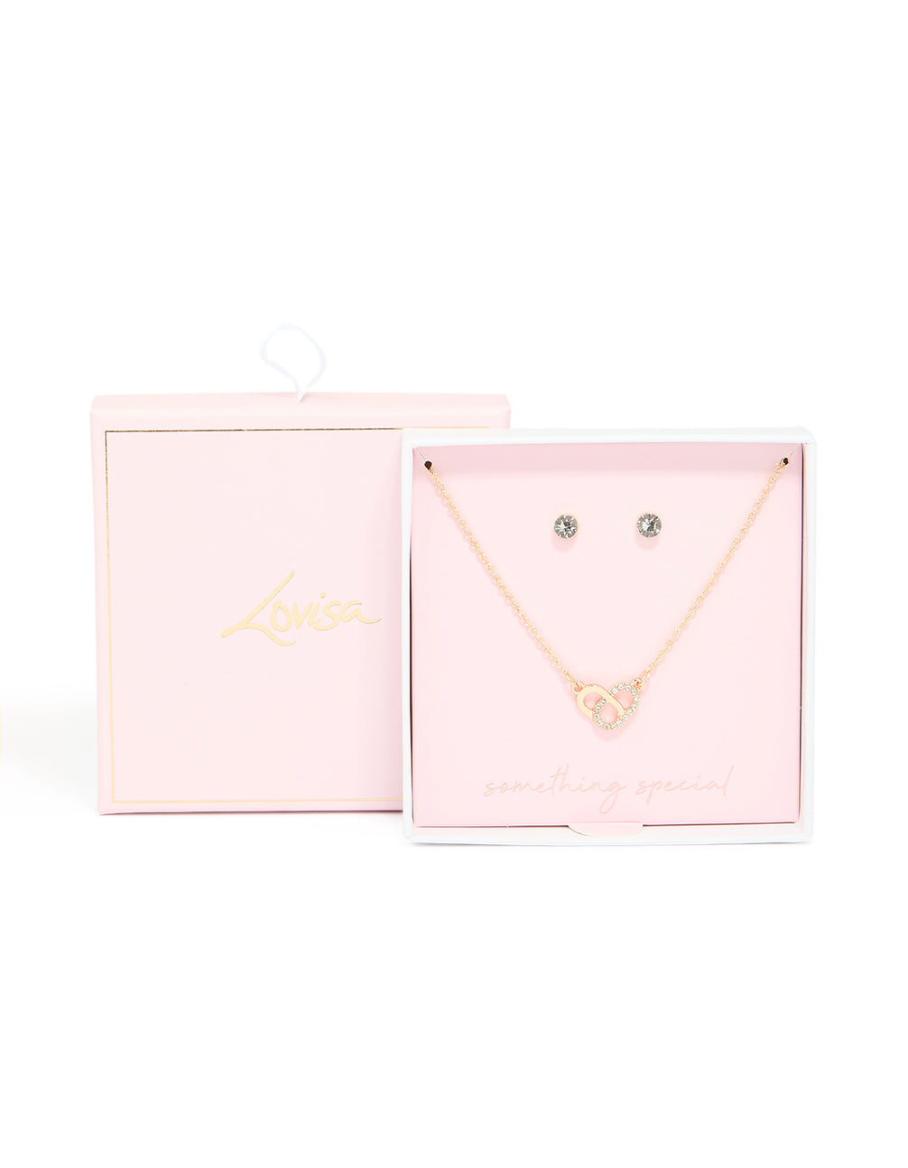 Gold Overlap Pendant Necklace & Classic Diamante Stud Earrings Set