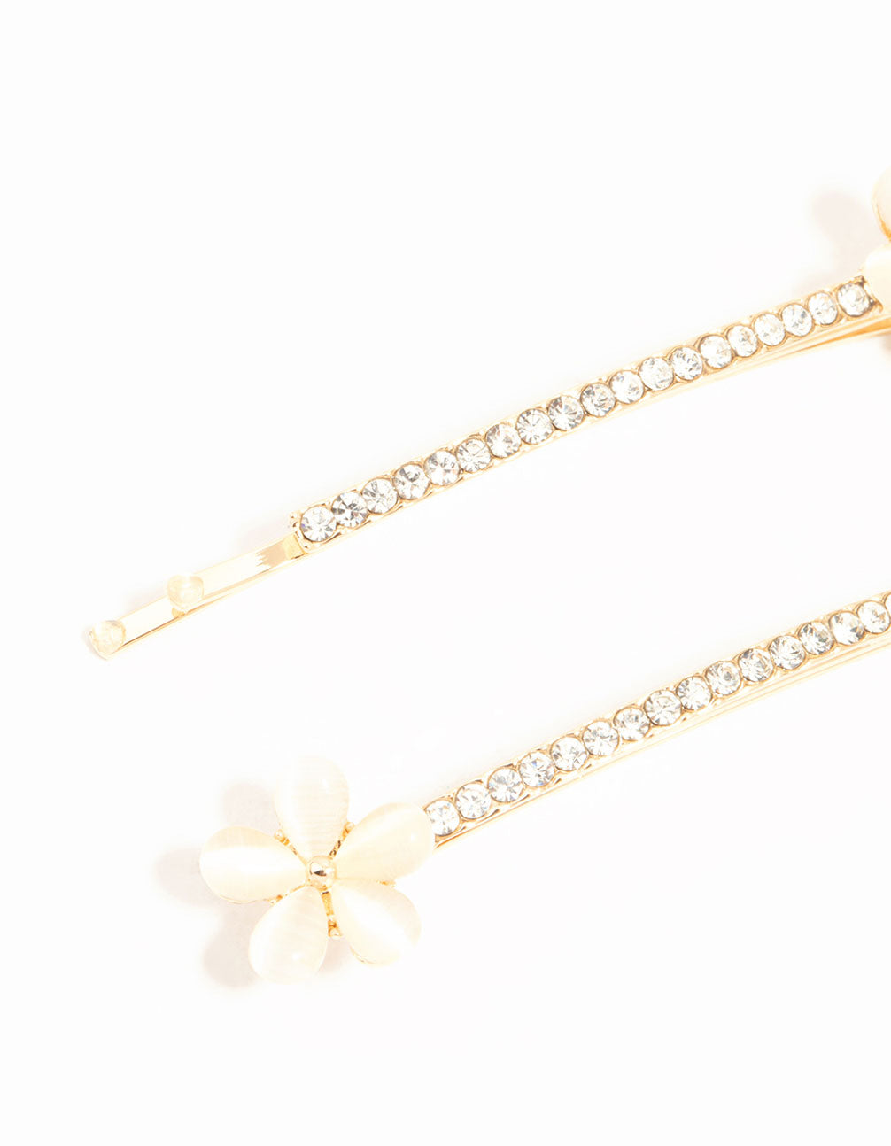 Upgrade your hair with these shimmering gold pave diamante flower slides. This two-pack adds a touch of luxury with its sparkling floral design. Simply slide them into your hair for a chic finish, perfect for weddings or any occasion.