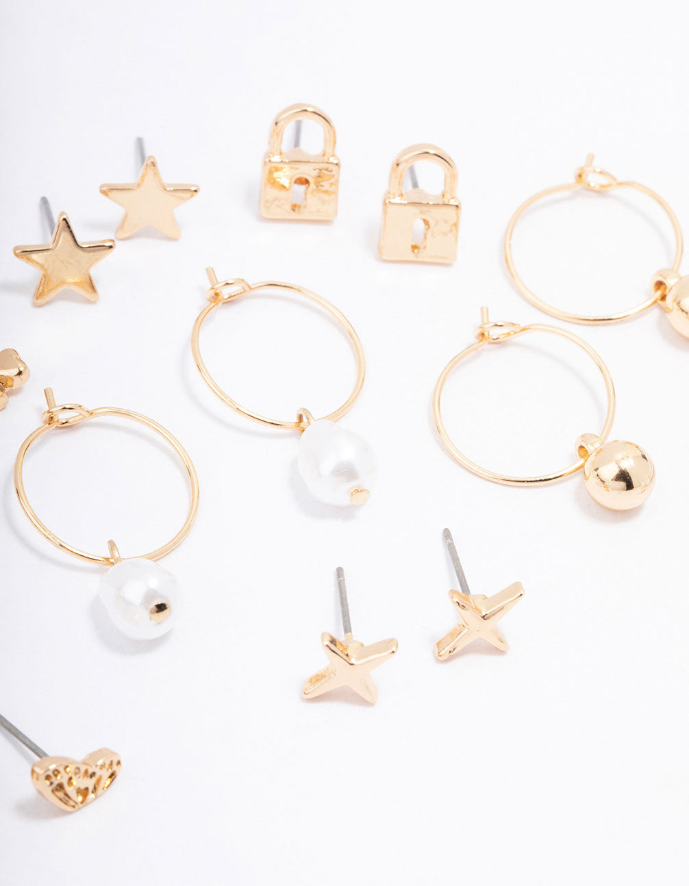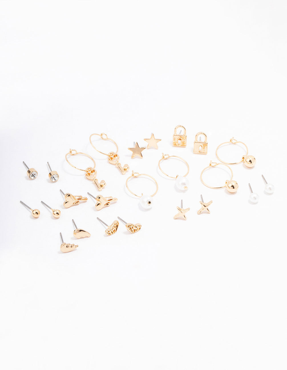 Create the ear stack of your dreams with this pack of gold-toned stud and hoop earrings. This jewellery pack includes twelve pairs of earrings, each adorned with diamantes and hearts for a romantic look.