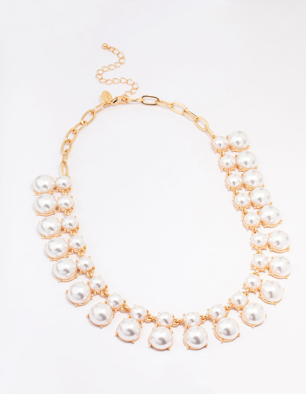 For an elegant touch to your outfit, style this gorgeous gold necklace. This statement necklace features two rows of pearls in graduating sizes, perfect for pairing with an evening or cocktail outfit.