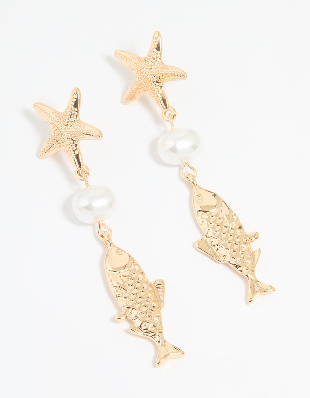 Add a splash of charm to your look with these Gold Pearl Fish Drop Earrings. These drop earrings feature a delicate starfish and fish-shaped design paired with lustrous pearls, making them the perfect blend of whimsical and timeless. Crafted in a gorgeous gold finish, they're versatile enough for everything from seaside strolls to dinner with friends. Style them with a breezy sundress for a relaxed day out or pair them with a sleek blouse and trousers for a polished evening look. Whether you're dressing up or down, these earrings will add a touch of fun sophistication to your outfit.