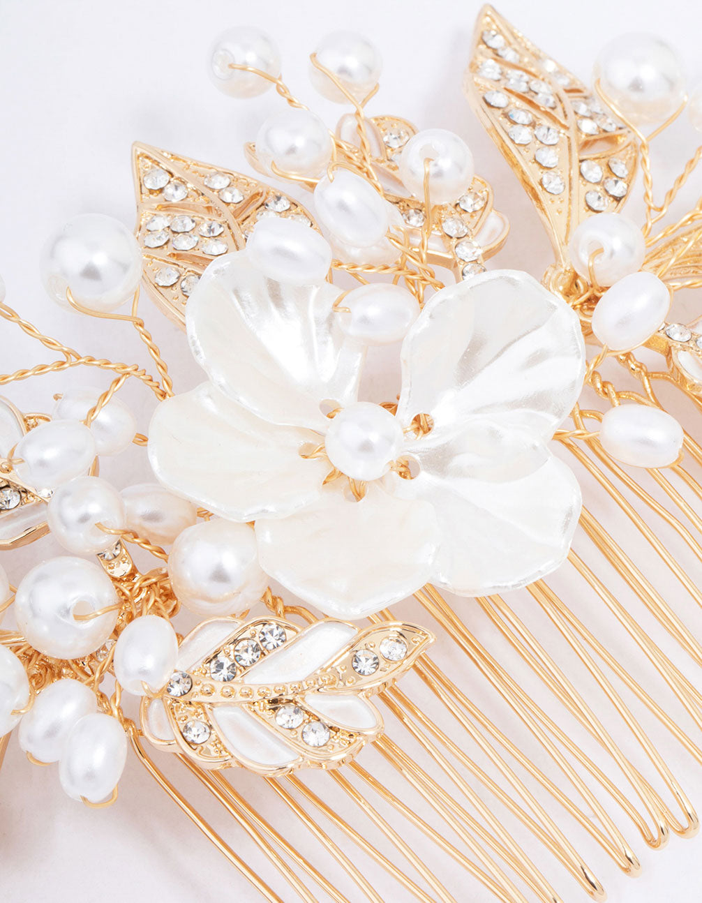 Add a decorative touch to your hairstyle with this gorgeous, gold hair comb. This dainty hair clip features a collection of floral motifs, adorned with delicate pearls. Perfect for up-do's and half-up hairstyles.