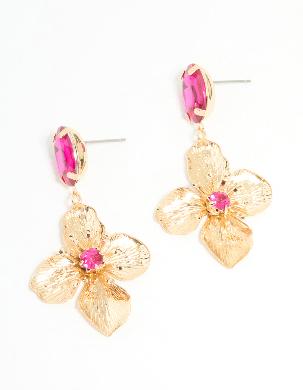 Gold Pink Diamante Hammered Flower Drop Earrings