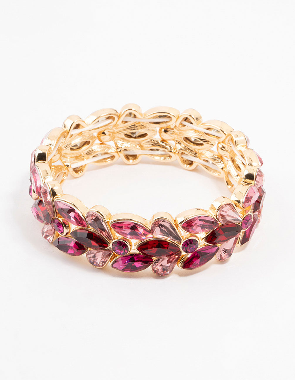 Make a bold statement with this avant-garde stretch bracelet. Decked out in stunning pink and red stones, it adds a chic, romantic flair to any outfit. Perfect for turning heads at your next event.