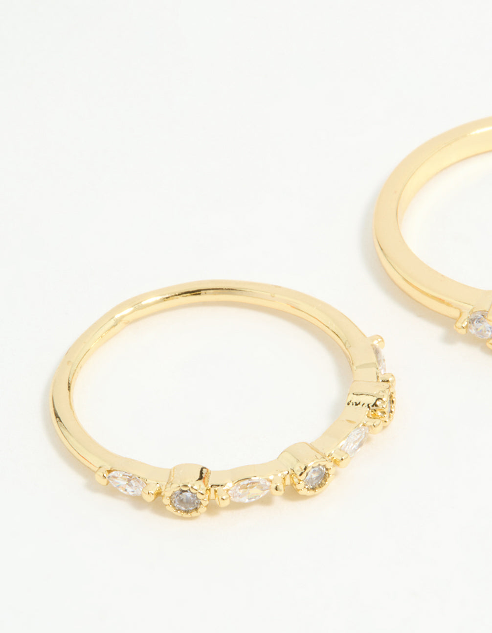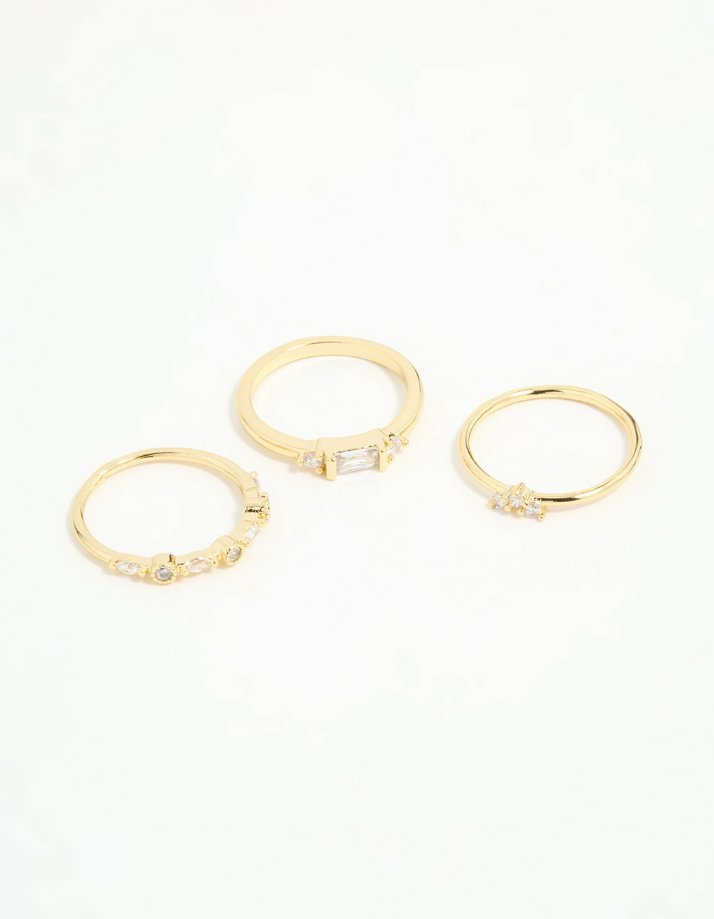 Upgrade your jewellery game with this gorgeous gold plated ring trio. This set includes three rings with sparkling baguette-cut and mini round gemstones, they can be worn individually or stacked for a bolder look.