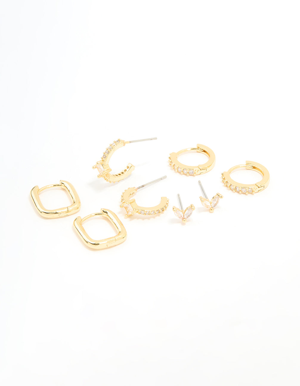Gold Plated Brass Cubic Zirconia & Plain Rectangle Earrings 4-Pack