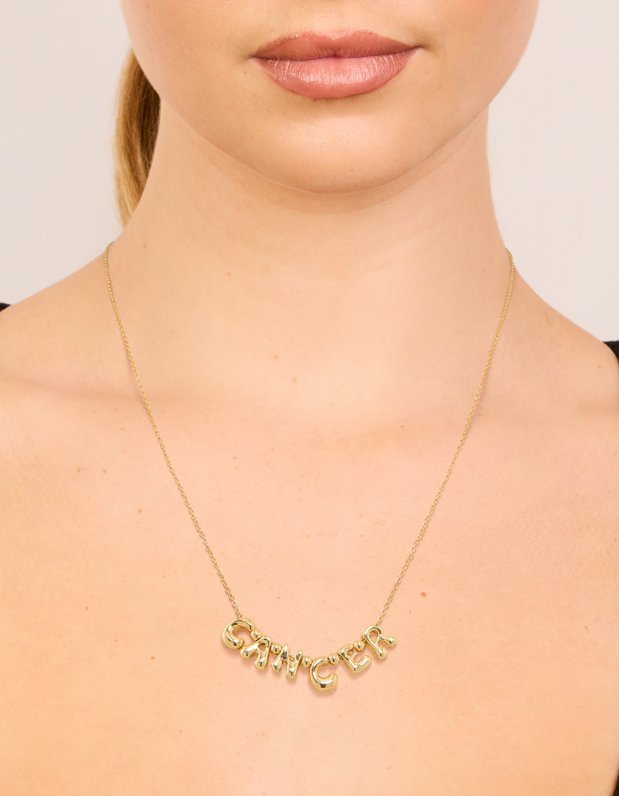 Celebrate your star sign in style with this Gold Plated Bubble Cancer Pendant Necklace! Perfect for astrology lovers, this piece combines personality and flair. This necklace features letters spelling out cancer to celebrate your star sign. Thoughtful and stylish, it's a great gift for Cancer babes who are known for their loyalty, creativity, and intuitive nature. Whether you're dressing up for a night out or adding a personalised touch to your workday, this necklace is a beautiful way to showcase your zodiac pride!