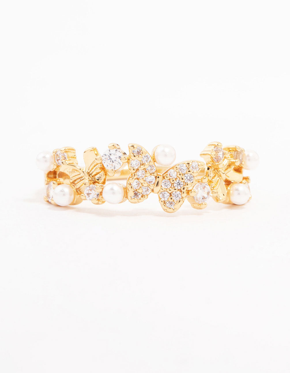 Embellish your stack with this luxe, gold plated ring. This dainty band features a collection of butterfly motifs, pearls and cubic zirconia crystals.