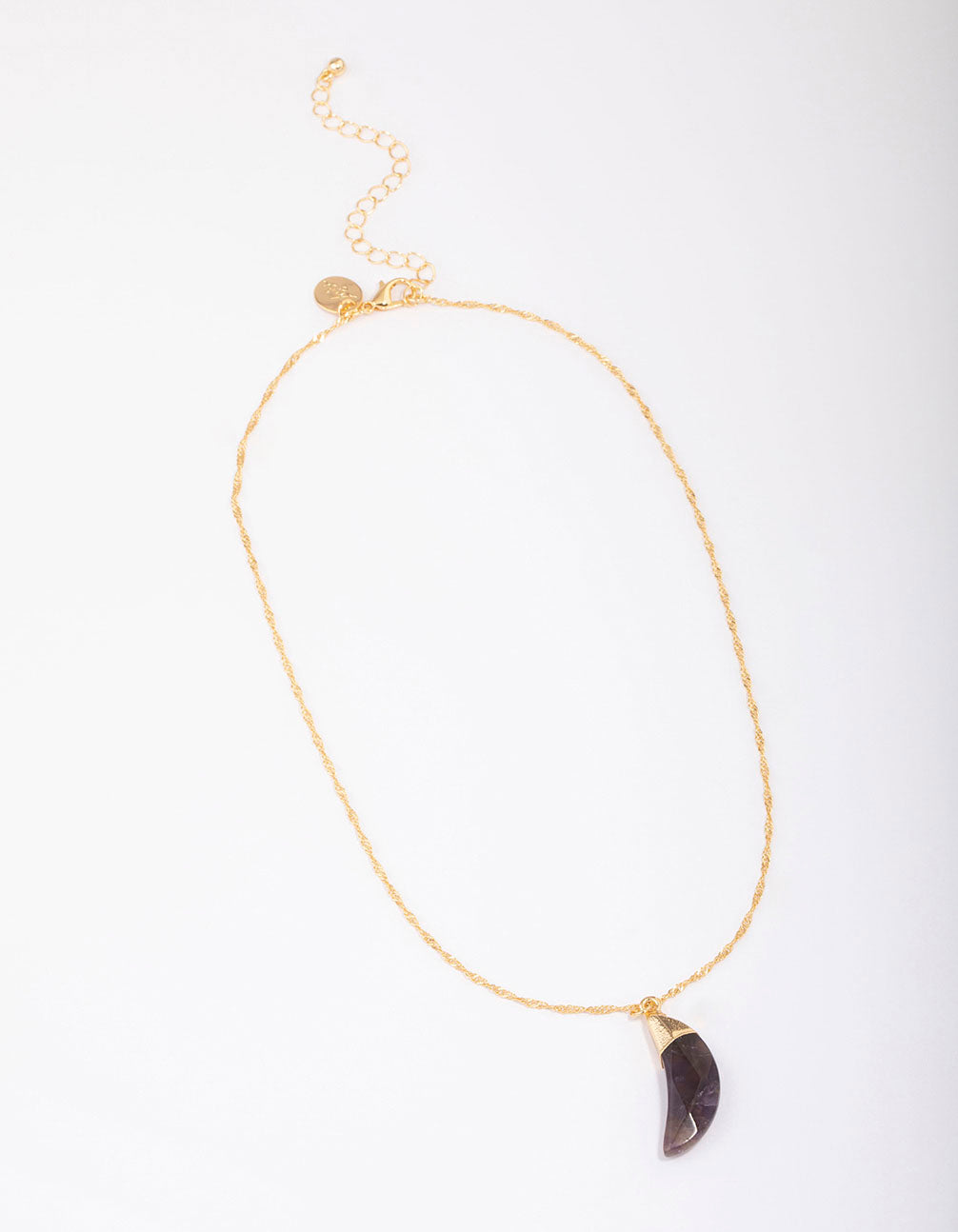 This chain is plated with real gold and features a crescent moon shaped amethyst pendant for a natural finish.