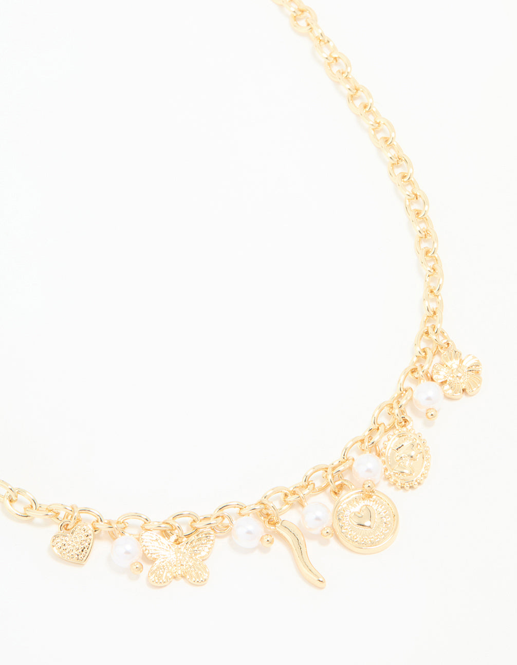 Elevate your accessory game with this Gold Plated Cross & Mixed Charm Necklace. This stunning piece combines a bold cross pendant with a playful mix of charms, making it a must-have for anyone who loves unique jewellery. Crafted with a sleek gold plating, it's perfect for adding a touch of shine to casual outfits or layering with other necklaces for a stylish vibe. Whether you're heading to a festival, a coffee date, or a night out, this pendant necklace is versatile enough to match any look. Pair it with a leather jacket for an edgy feel or a flowy dress for boho-chic vibes. This charm necklace is your ultimate go-to for effortless style!