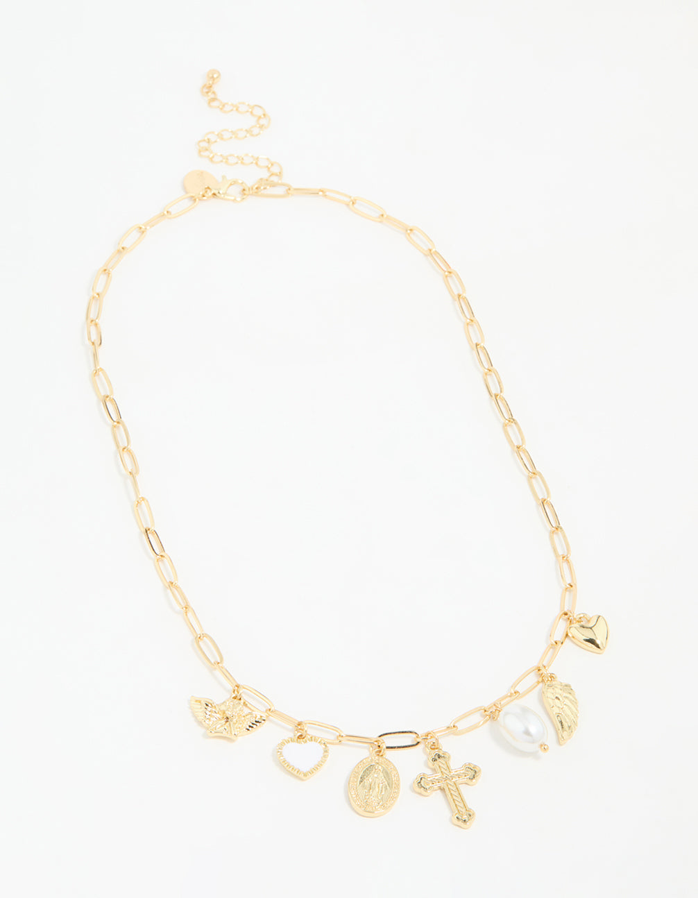 Shine with this Gold Plated Cross & Pearl Charm Necklace! This delicate piece features charms like crosses and pearls and is perfect for adding elegance and playfulness to any outfit. Ideal for layering or wearing solo.