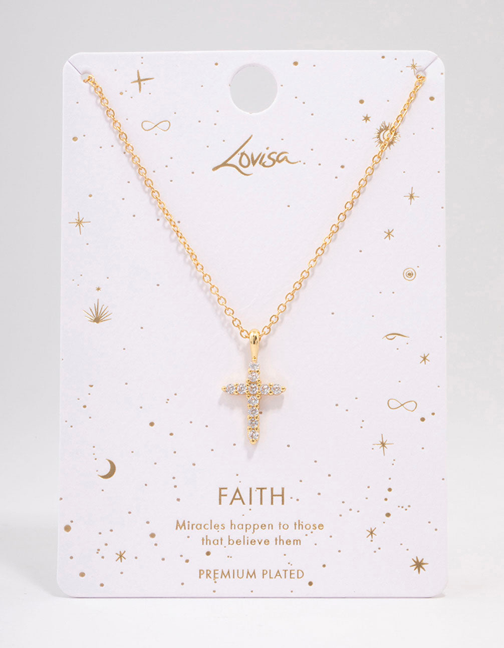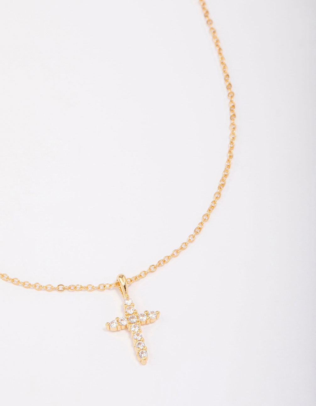 This chain is plated with real gold and features a crystal cross pendant for a timeless touch.
