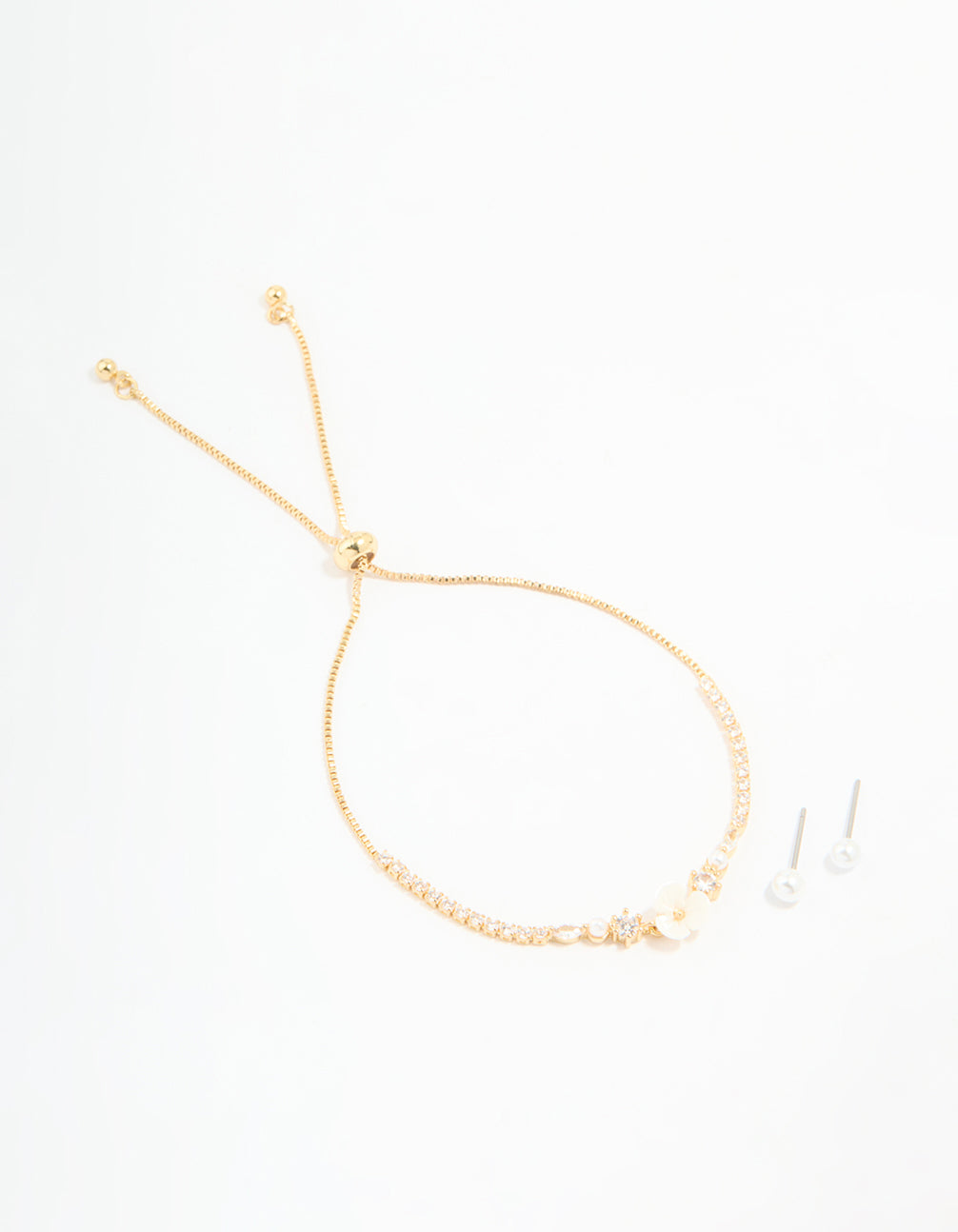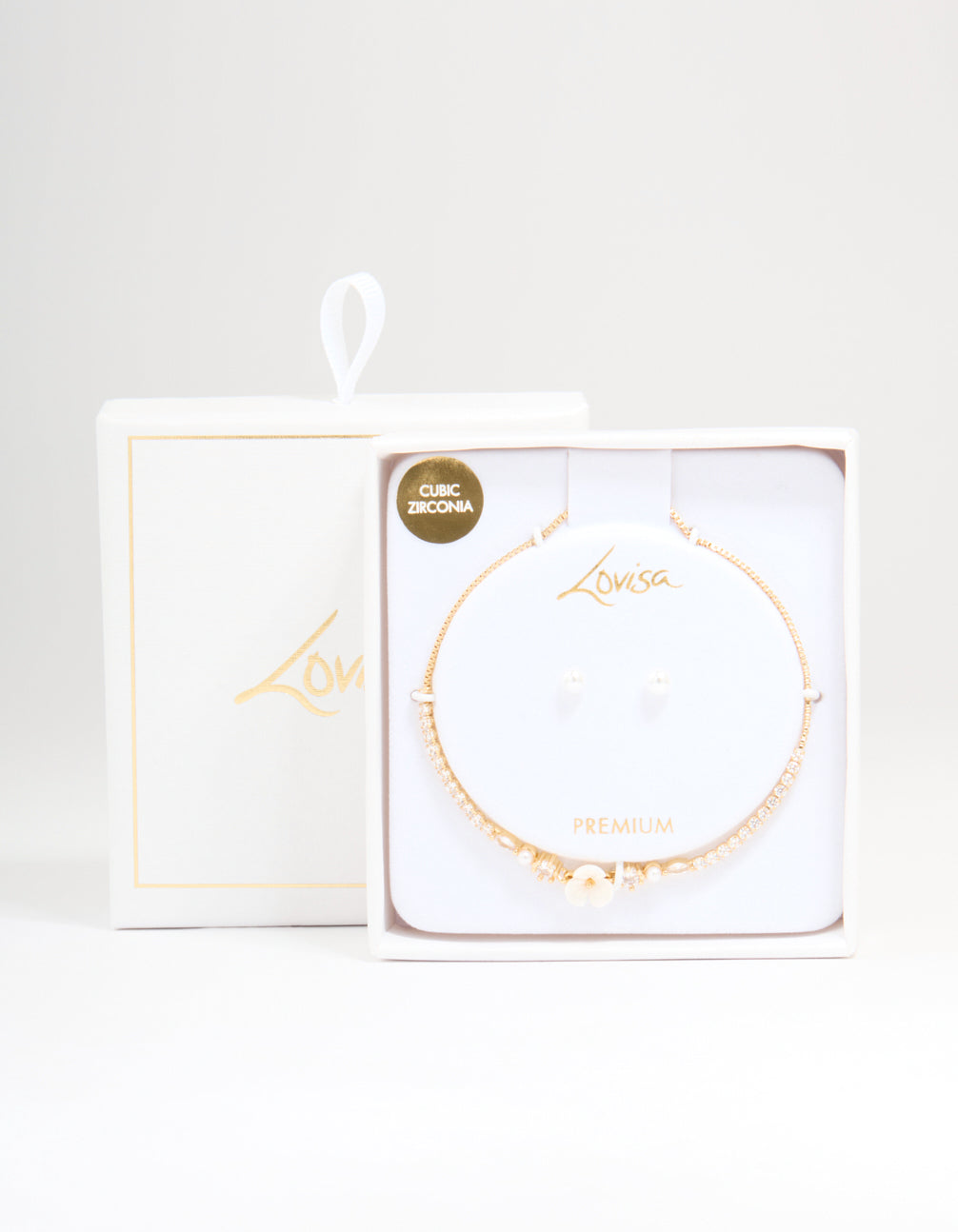 Add a touch of elegance to your look with this Gold Plated Cubic Zirconia Acrylic Flower Toggle Bracelet & Earrings Set. This stunning jewellery set combines gold plating with delicate cubic zirconia crystals and floral acrylic details for a fresh, youthful vibe. Perfect for weddings, parties, or brunches, the bracelet's toggle design ensures comfort and style, while the matching earrings complete the look effortlessly. Pair this set with a flowy dress for a whimsical charm or dress it up with a sleek outfit for modern sophistication. Ideal for those who love beautiful wristwear and playful earrings, it's a versatile addition to any jewellery collection!