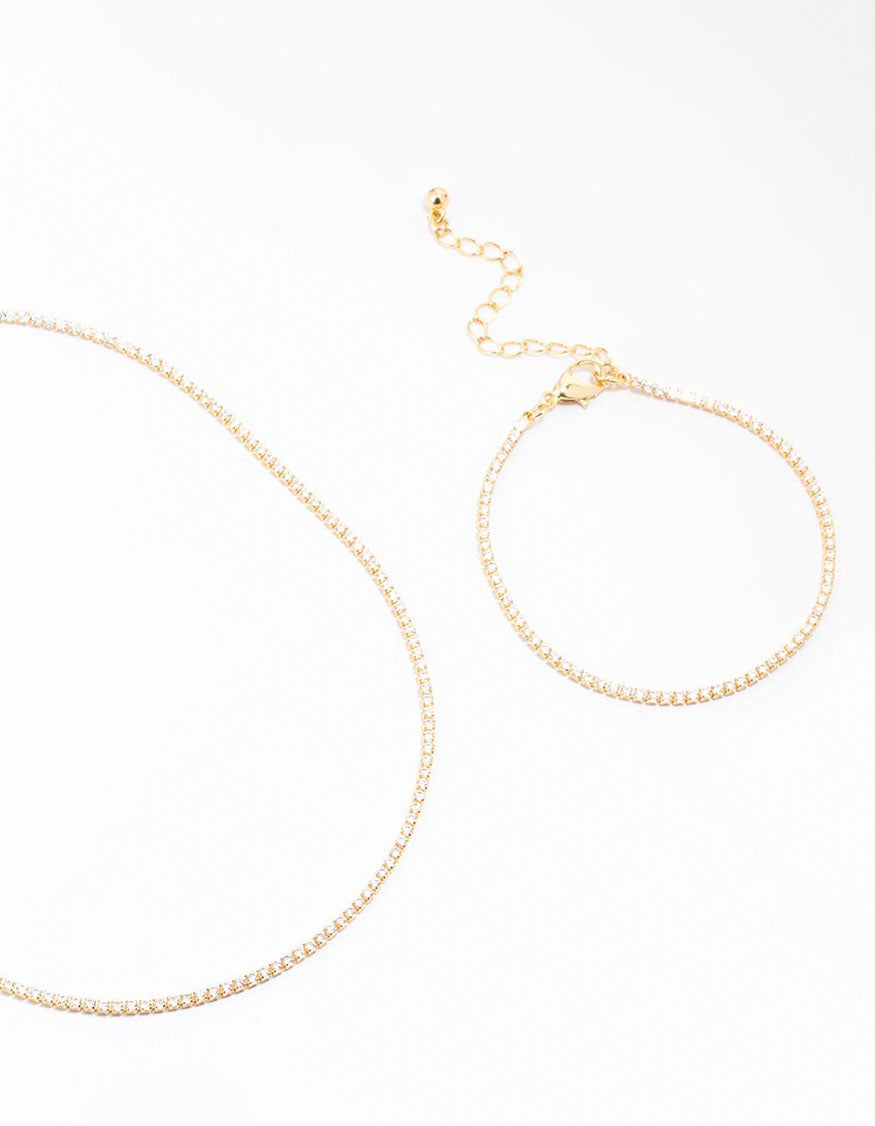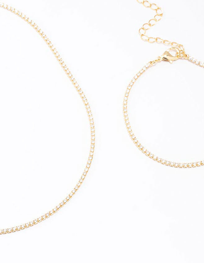 Gold Plated Cubic Zirconia Tennis Bracelet & Necklace Set