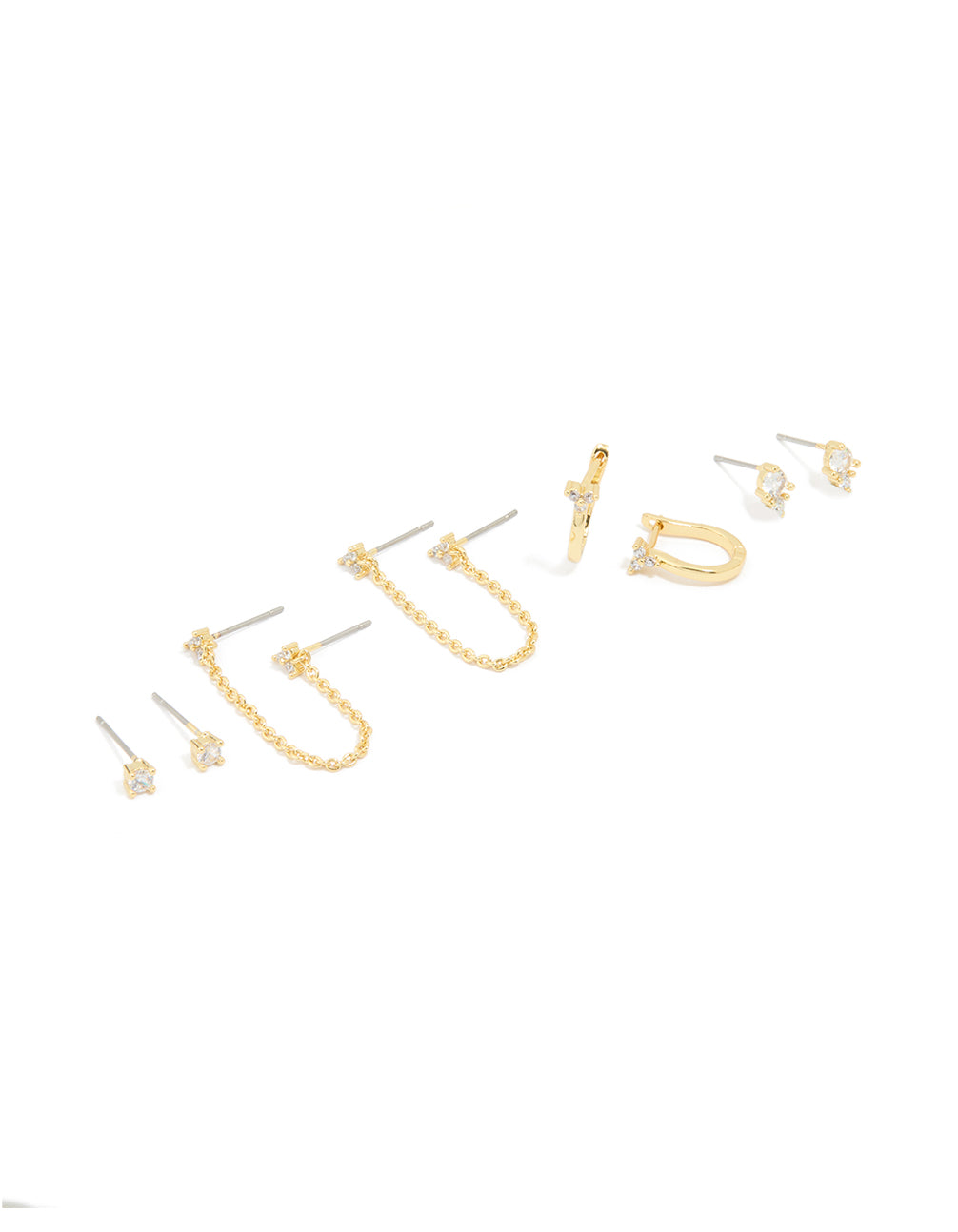 Gold Plated Cubic Zirconia Dainty Chain & Mixed Earrings 5-Pack
