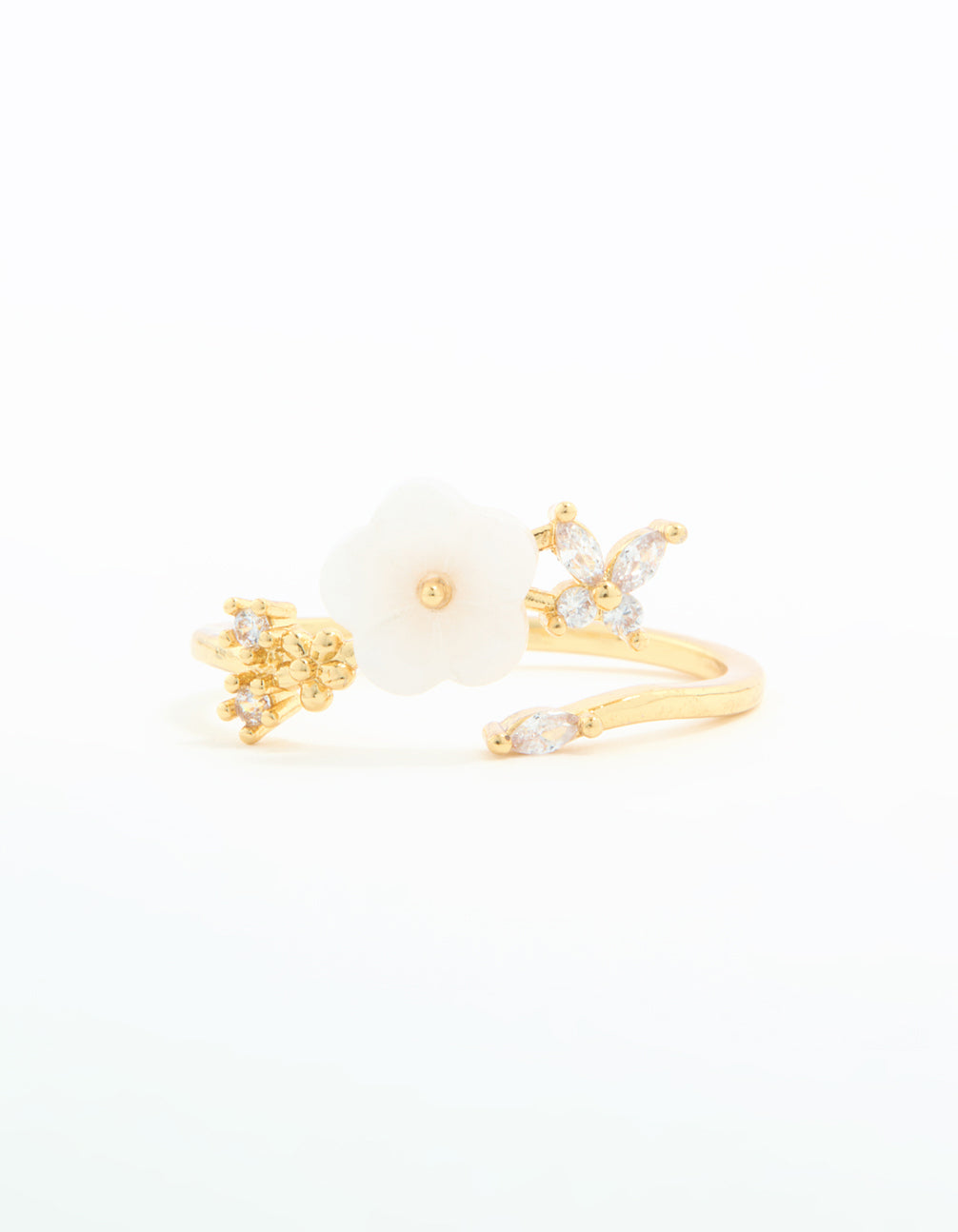 Add a touch of elegance and charm to your jewellery collection with this Gold Plated Cubic Zirconia Lovely Flower Wrap Around Ring. This ring features a wrap-around design that delicately curves around your finger, adorned with shimmering cubic zirconia crystals arranged in a delightful flower shape. Its gold-plated finish gives it a polished, luxe look, making it perfect for any occasion, from casual coffee dates to special evening events. Whether you're pairing it with other rings for a stylish stacked style or letting it shine solo, this versatile piece adds a youthful yet sophisticated vibe to your outfit. Ideal for those who love floral-inspired jewellery, this wrap ring is a must-have accessory to elevate your day-to-night wardrobe.