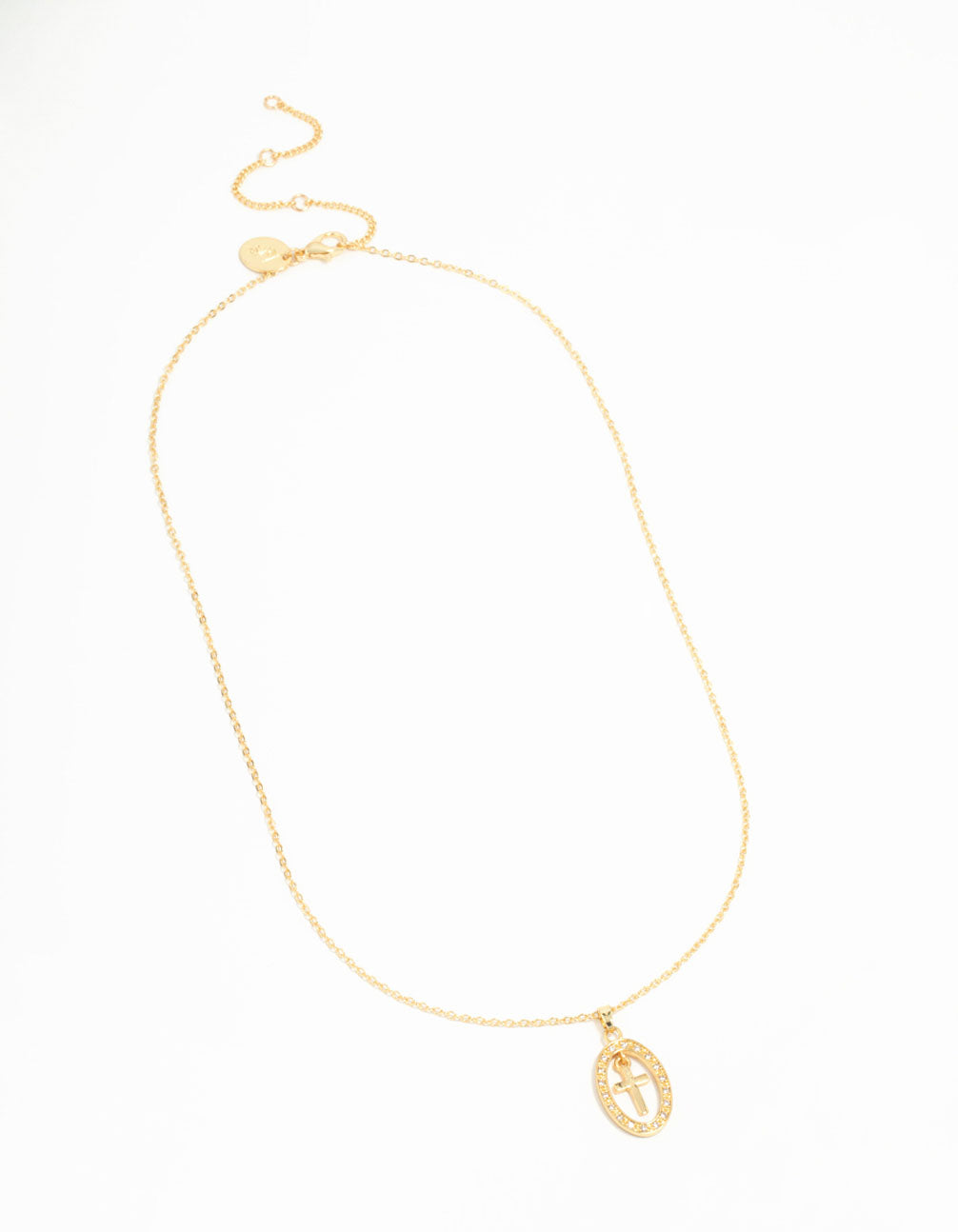 This necklace is perfect for an elegant yet minimalistic look. It features a gold-toned base and an oval cross pendant encrusted with cubic zirconia, making it great for a sophisticated look.