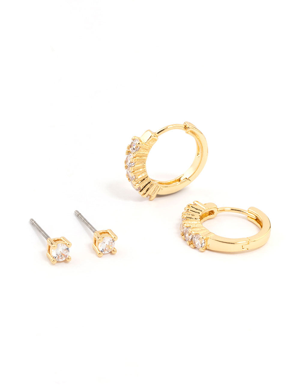 Gold Plated Cubic Zirconia Stud & Small Hoop Earrings 2-Pack