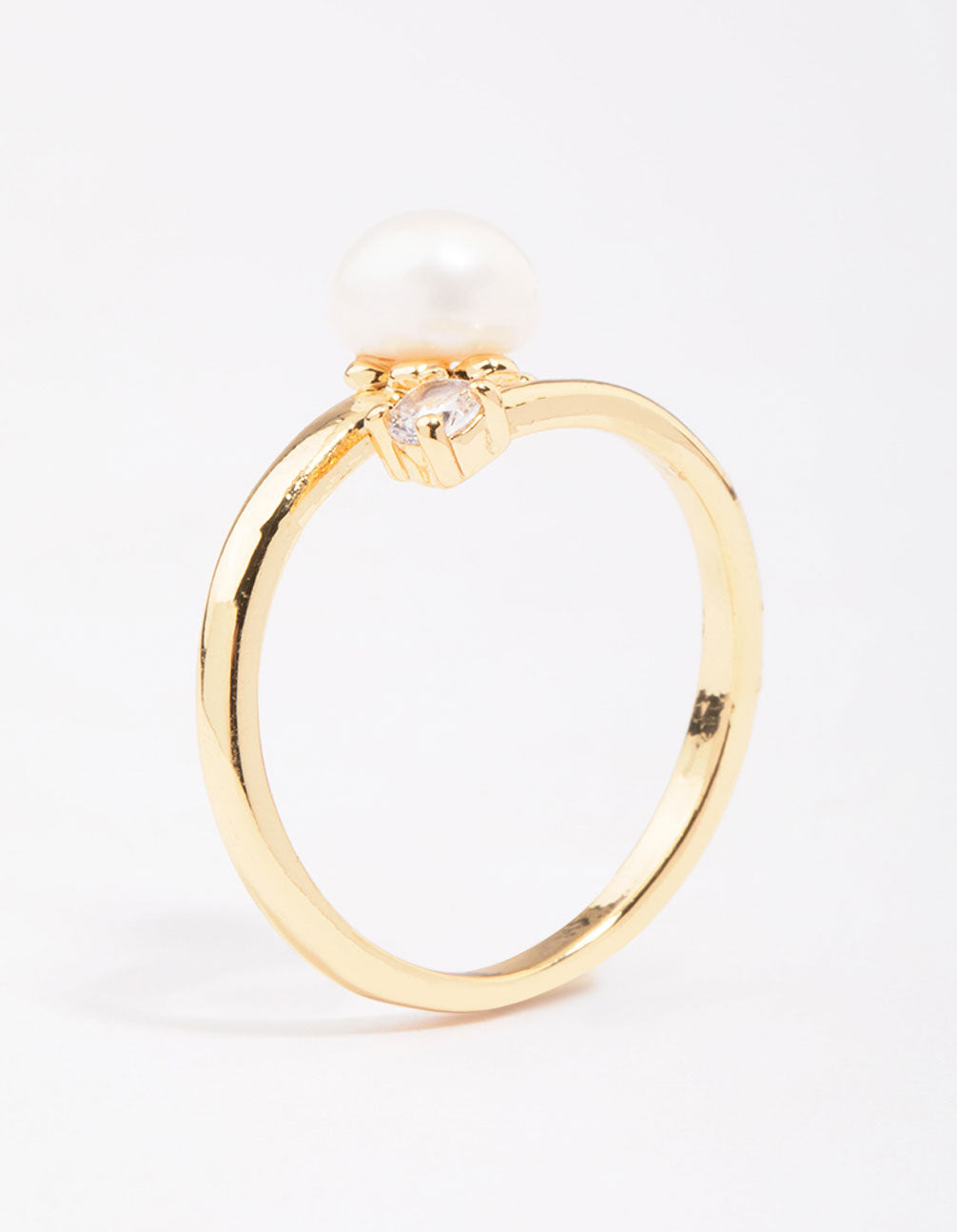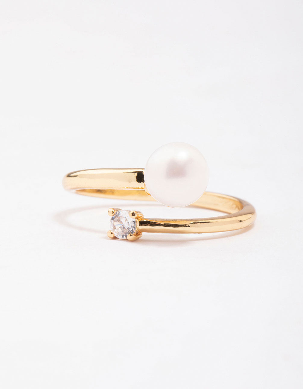 For a signature addition to your stack, style this gold plated stacking ring. This ring features a wrapped silhouette and dainty profile, adorned with a single round pearl and cubic zirconia crystal in the centre for a refined finish.