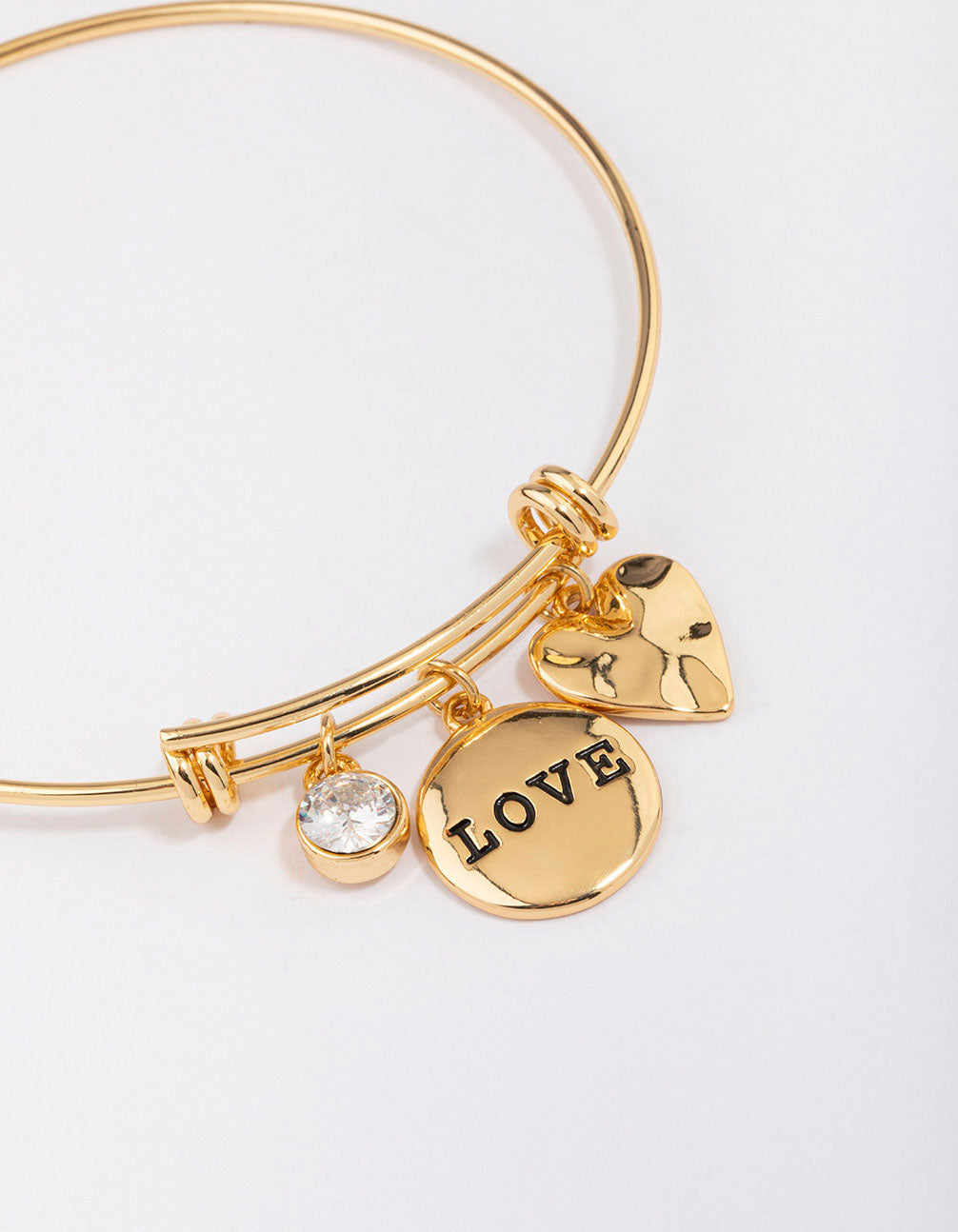Carry a memento of gratitude with this timeless, gold plated bangle. This premium bangle is plated with real gold and features a collection of gold charms, including a coin disc with the word 'love' engraved.