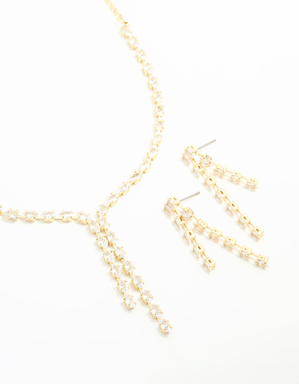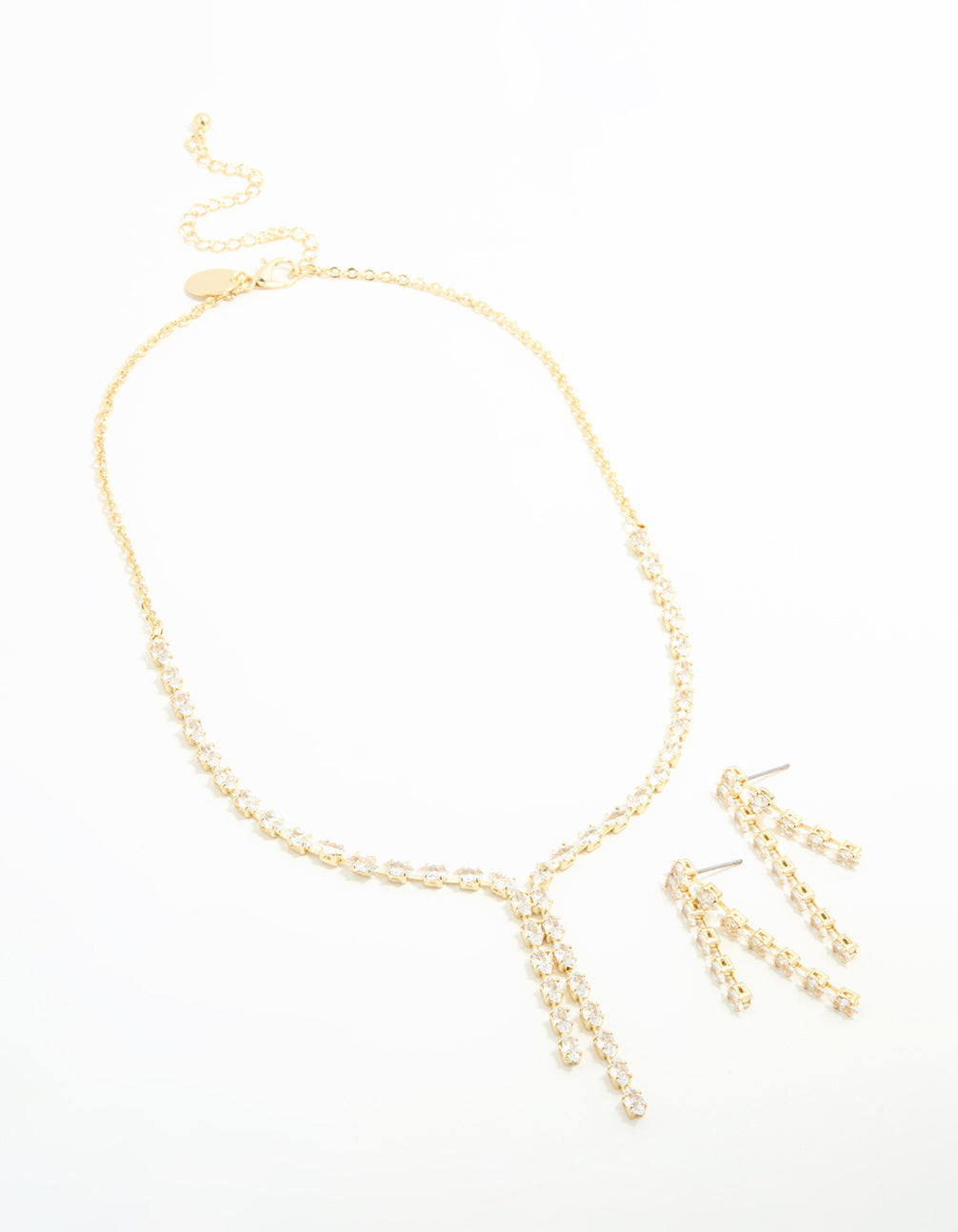 Complete your look with this effortlessly elegant Gold Plated Double Drop Necklace & Earrings Set. Featuring a sleek double drop design, this gold plated jewellery set is perfect for a polished vibe.