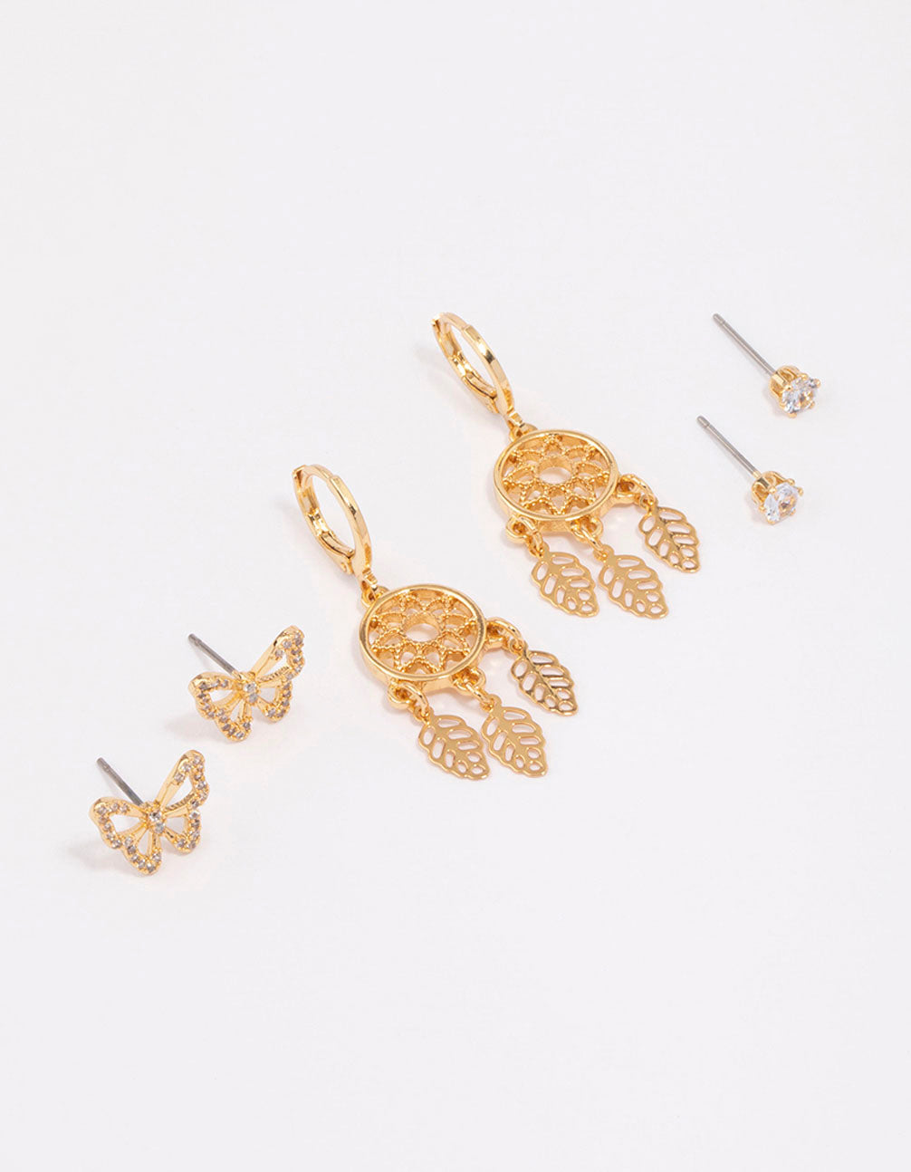 This pack includes a pair of ornate, dreamcatcher hoops and butterfly studs for a whimsical look.