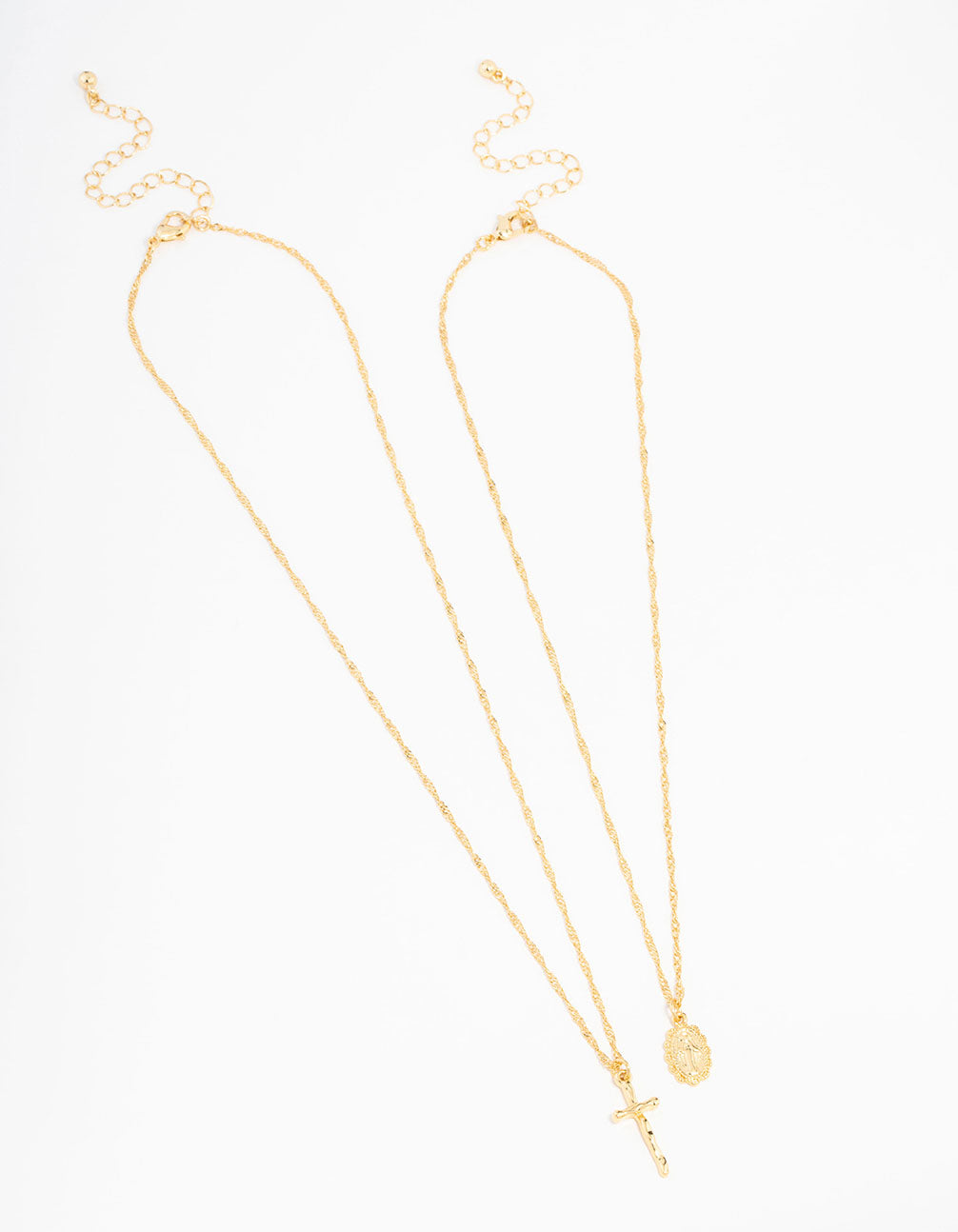 Gold Plated Mary Hammered Cross Necklace 2-Pack