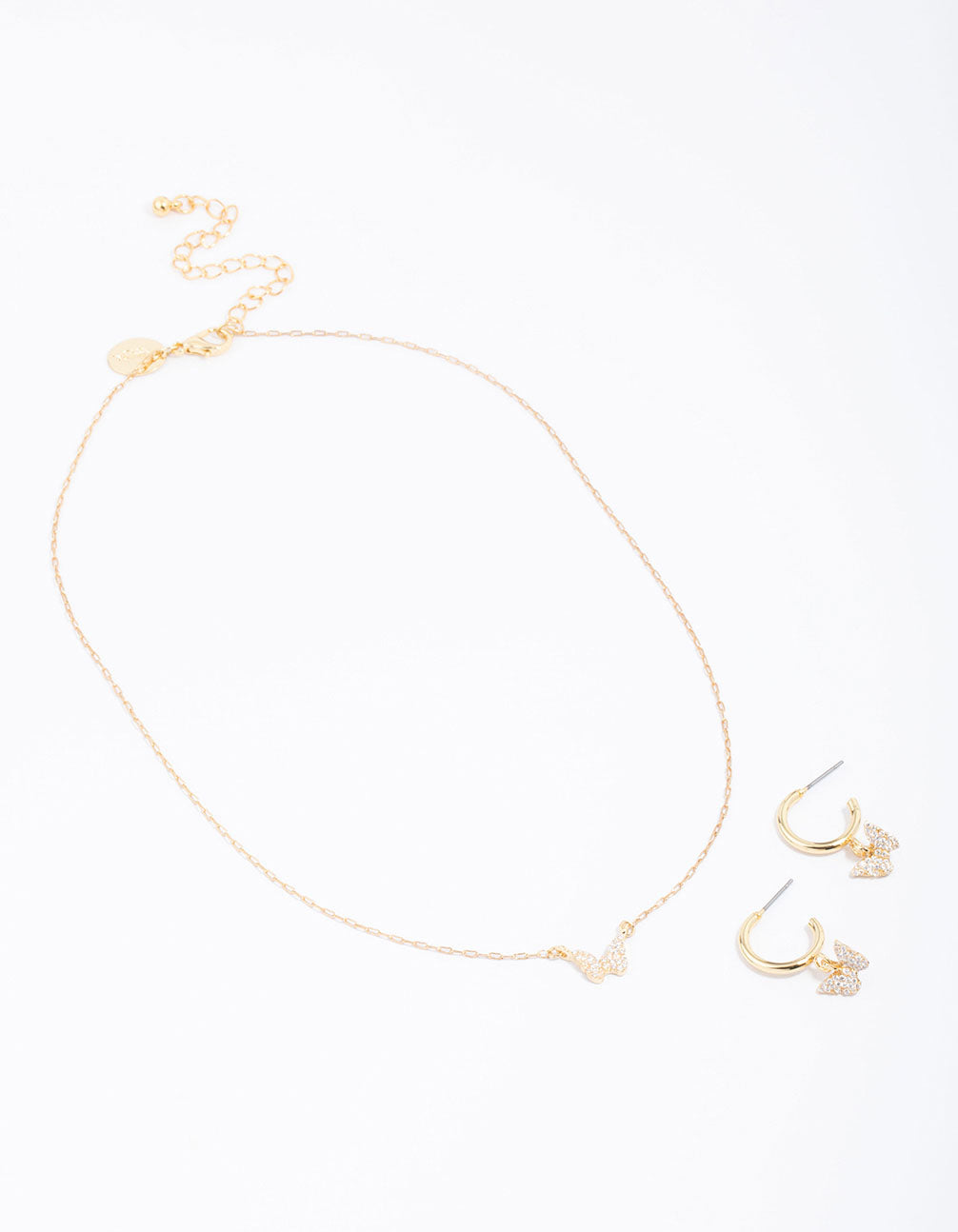 Add a graceful touch to your outfit with this premium, gold plated jewellery set. This matching set contains a fine gold chain and pair of huggie hoops, both designed with butterfly motifs for a trending addition to your stack.