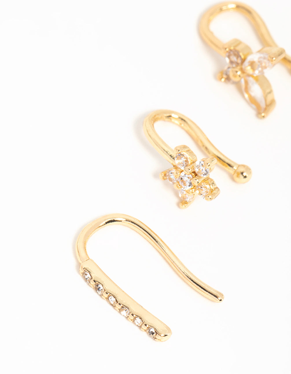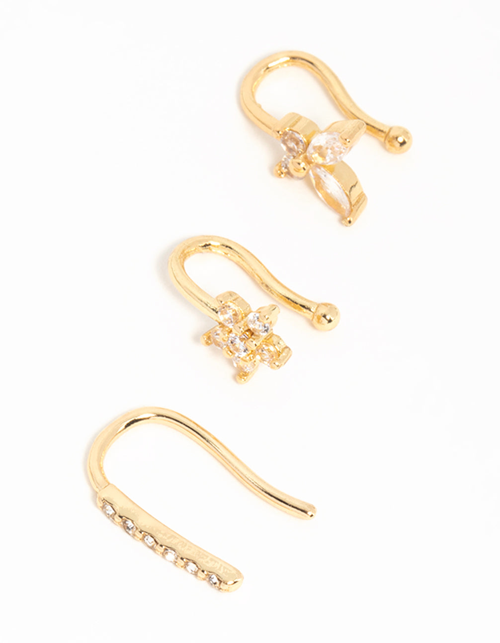 Try out the nose piercing look without the commitment. This gold-plated trio of fake nose piercings with cubic zirconia crystal flowers and nature designs lets you rock the look effortlessly. Try it out and shine!