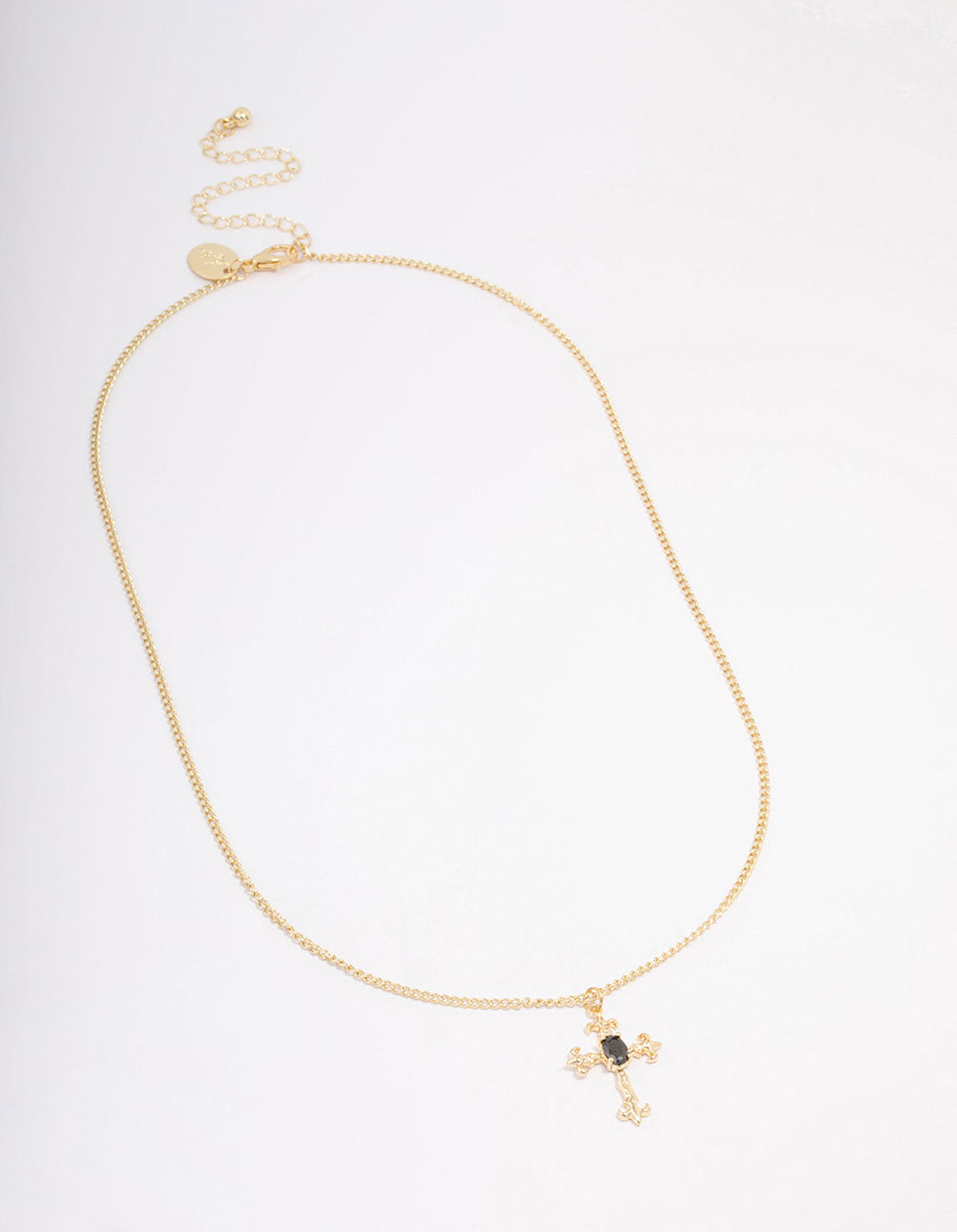 For a refined finish to your look, style this gold plated pendant necklace. This signature necklace is plated with real gold and features an ornate cross motif, adorned with a baguette-cut stone in the centre.
