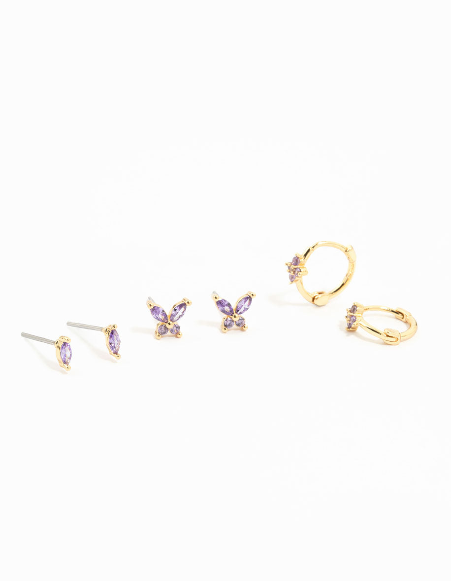 Gold Plated Purple Cubic Zirconia Butterfly Earrings 3-Pack