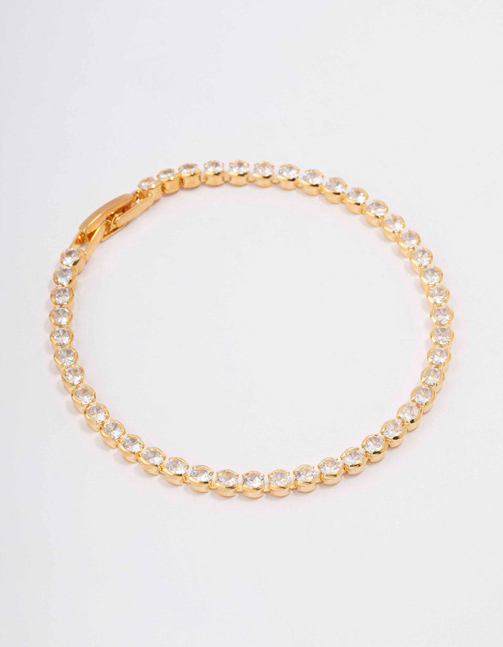 This tennis bracelet is plated with gold with a brass baseand encrusted with miniature crystals for added sparkle.