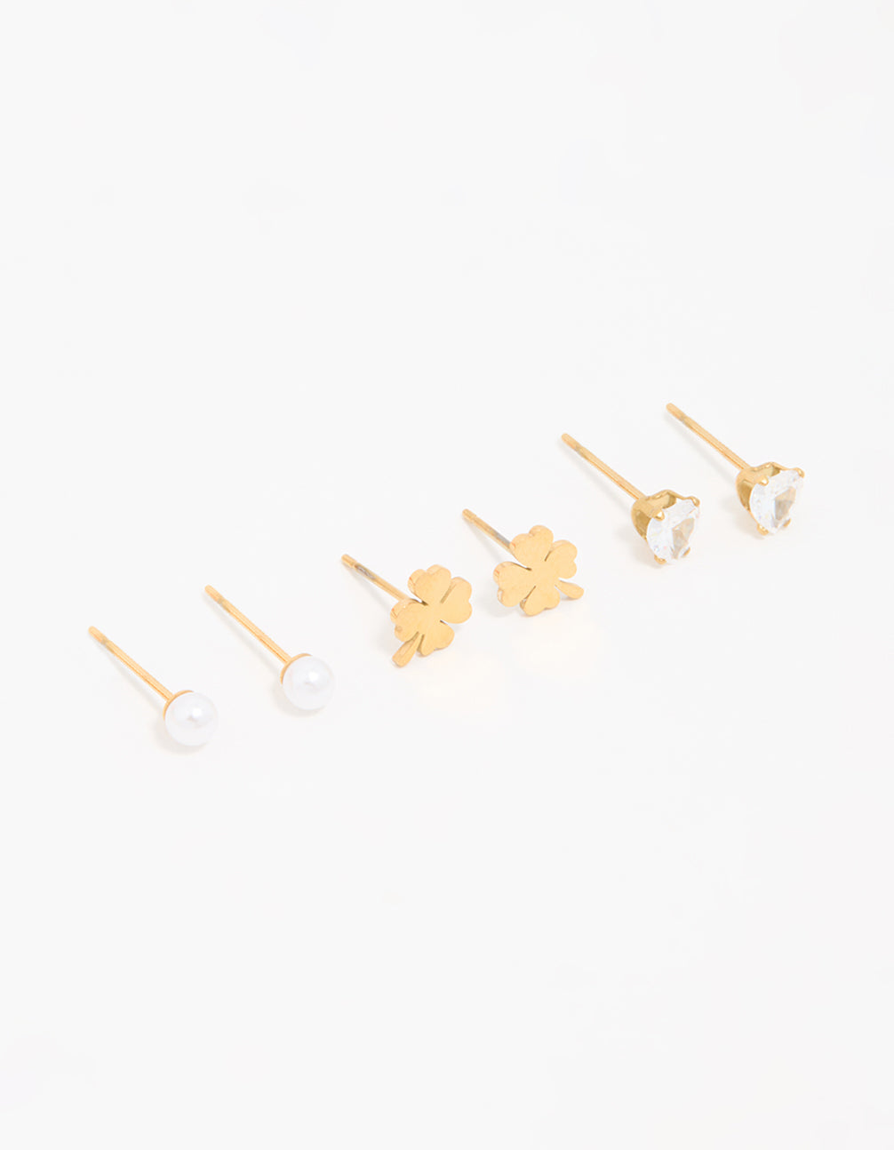 Add a little luck to your everyday style with this Waterproof Gold Plated Stainless Steel Clean Clover Stud Earrings Pack. Featuring a trio of chic designs, including sleek clover-shaped studs, these earrings are crafted from durable stainless steel with gold plating.