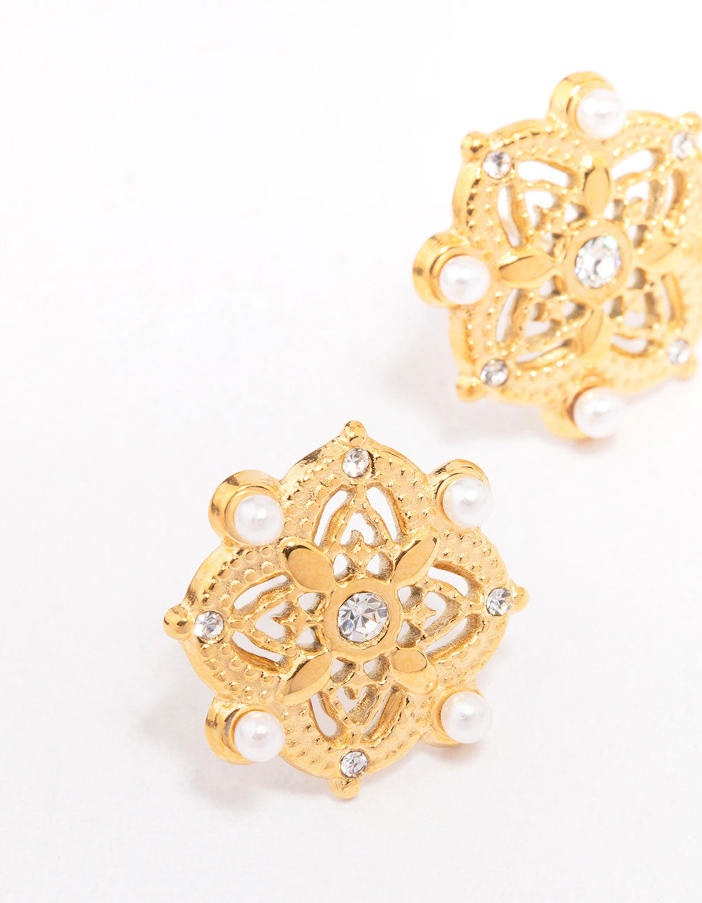 Waterproof Gold Plated Stainless Steel Diamante & Pearl Boho Stud Earrings