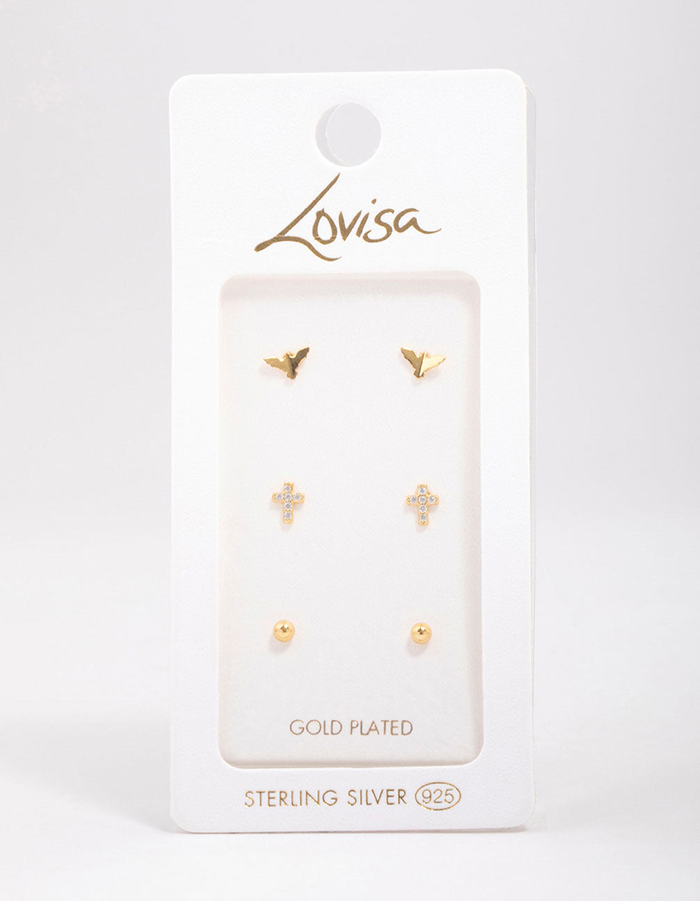 Gold Plated Sterling Silver Bird & Rose Stud Earring 3-Pack